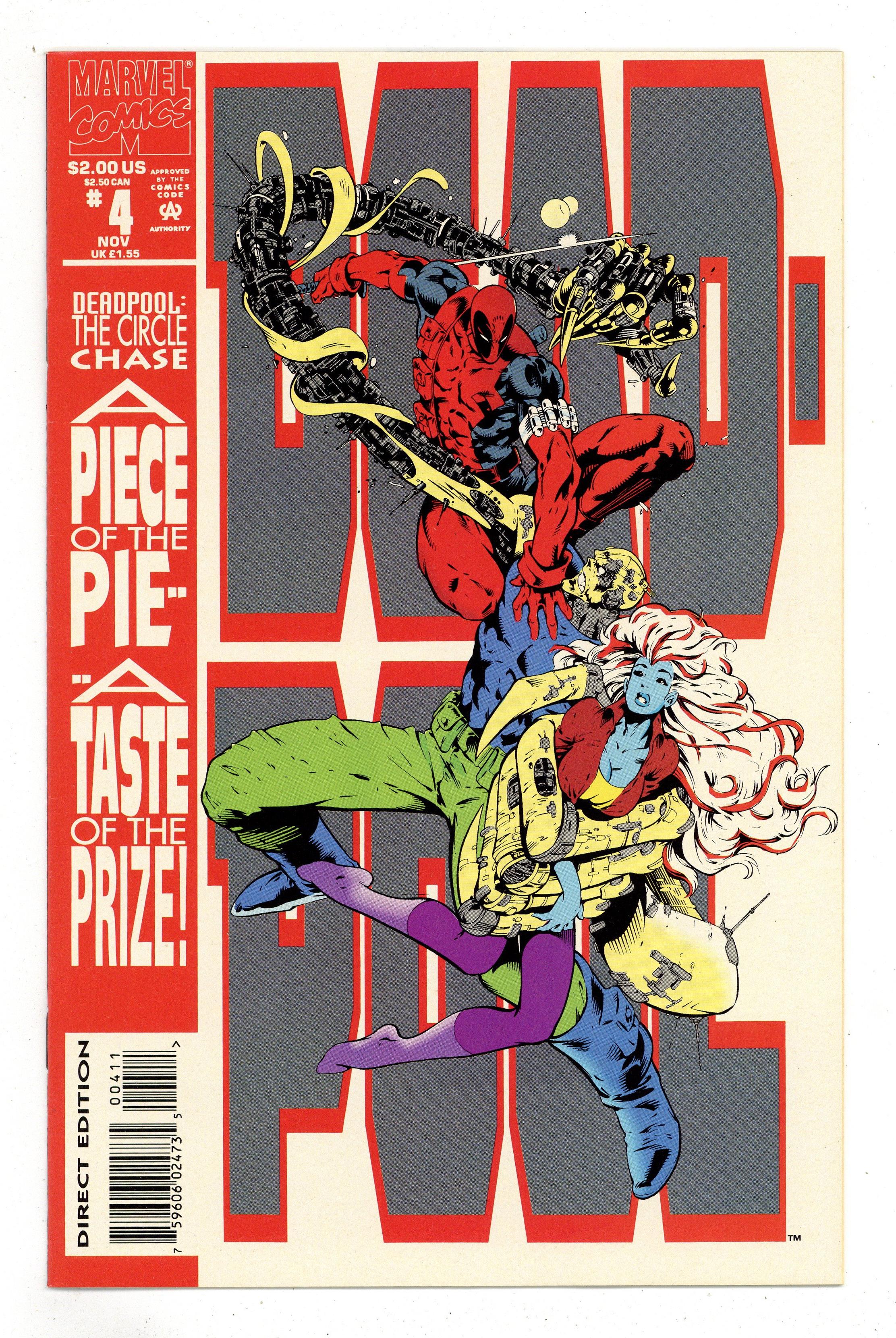 Direct Edition. The Circle Chase Round 4: Duck Soup - Written by Fabian Nicieza. Art by Joe Madureira and Harry Candelario. Don't miss the dramatic conclusion to the search for Tolliver's will! It's Deadpool against Slayback, plus Vanessa and Weasel against Zero in this page-turning slugfest! When Deadpool finally meets up with Vanessa, it may be too late to save her! 32 pages, full color. Cover price $2.00.