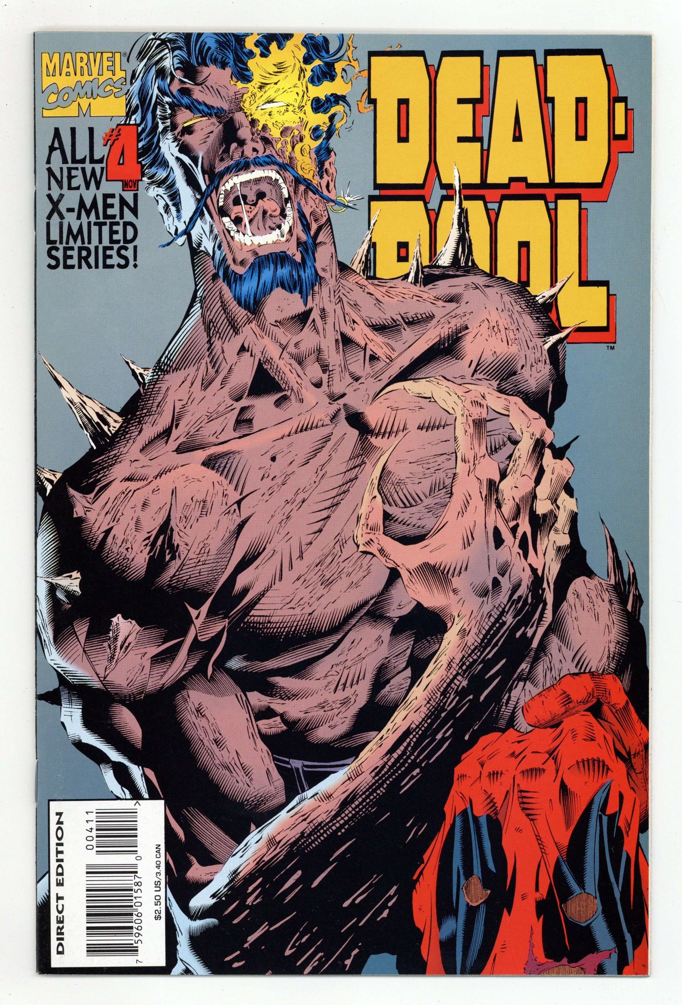 Direct Edition. Cover pencils by Ian Churchill, inks by Bud LaRosa. Mano a Mano, script by Mark Waid, pencils by Ian Churchill and Ken Lashley, inks by Bud LaRosa, Tom Wegrzyn, Philip Moy, and W. C. Carani; DP, Siryn and Banshee battle Juggernaut and Black Tom, who has been fitted with Pool's severed hand; As Killebrew's solution to Tom's condition takes a turn for the worse, the heroes and villains cease hostilities as Black Tom is taken in for medical help by Banshee; Deadpool makes off with Killebrew, the man who created him for Weapon X, so the good doctor can find out why his healing factor is failing. Cover price $2.50.