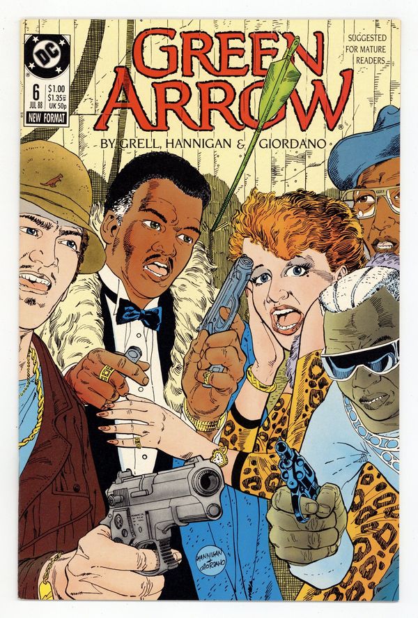 The gang wars in the streets of Seattle rage on while Green Arrow investigates a series of brutal attacks on the gay community. Part 2 of 2. Written by Mike Grell, with art by Ed Hannigan and Dick Giordano. Cover by Hannigan and Giordano. Suggested for Mature Readers. New Format. Cover price $1.00.