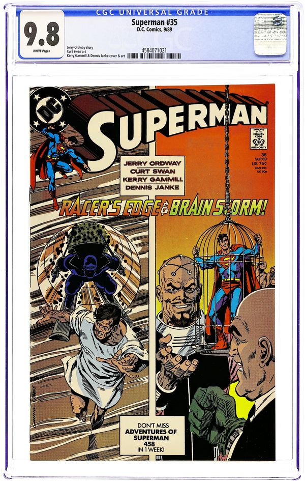 "Visions of Grandeur!" Cameo by Darkseid. Story by Jerry Ordway. Art by Curt Swan and Dennis Janke. And, "The Racer's Edge!" Story by Jerry Ordway. Art by Kerry Gammill and Dennis Janke. It's the return of Curt Swan to the pages of Superman! In this double feature, Brainiac and Lex Luthor return to plague the Man of Steel. Plus, Morgan Edge is paid a visit by the Black Racer of the New Gods. Cover price $0.75.