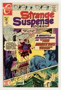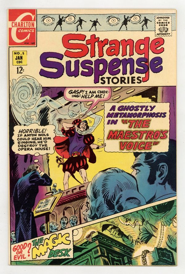 Cover by Ernie Bache, Mo Marcus? and Vince Alascia. Edited by Sal Gentile. Stories by unknown. Art by Ernie Bache, Mo Marcus?, Vince Alascia and unknown. Four tantalizing Strange Suspense Stories! In this issue: Good or evil? Find out in..."The Magic Desk" with art by Ernie Bache. Plus: A ghostly metamorphosis in..."The Maestro's Voice" with art by Mo Marcus? and Vince Alascia; "The $100 Bills!"; and 1-page text story "The Seven Snakes of San Sarga"! 32 pages, full color. Cover price $0.12.