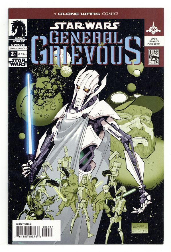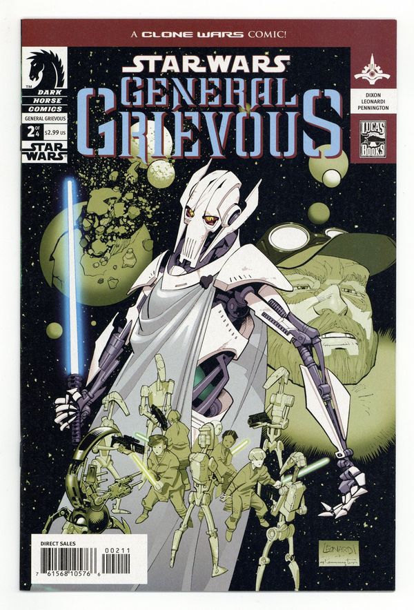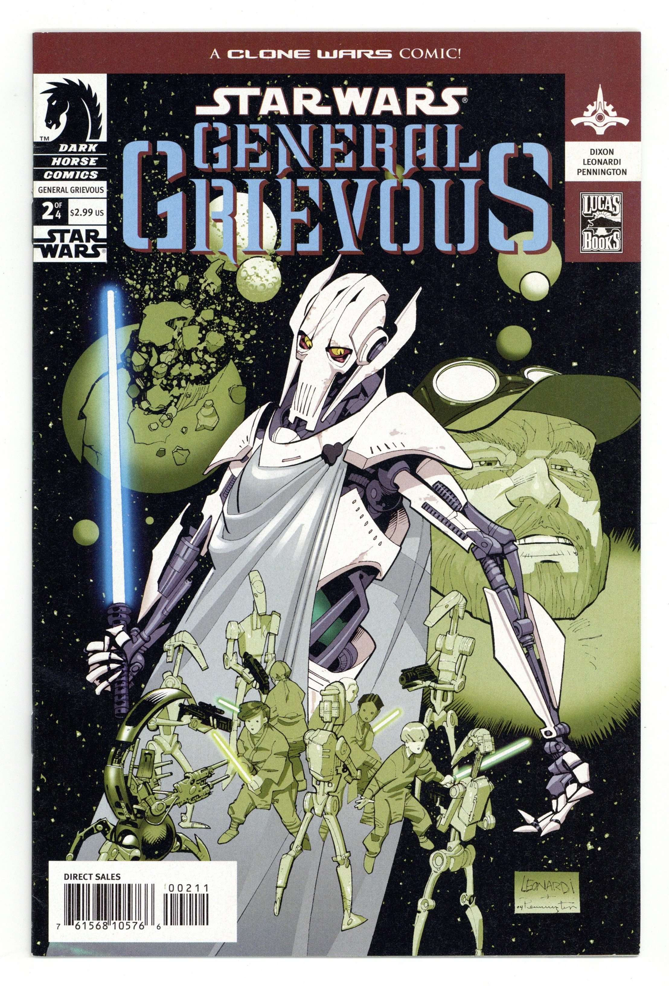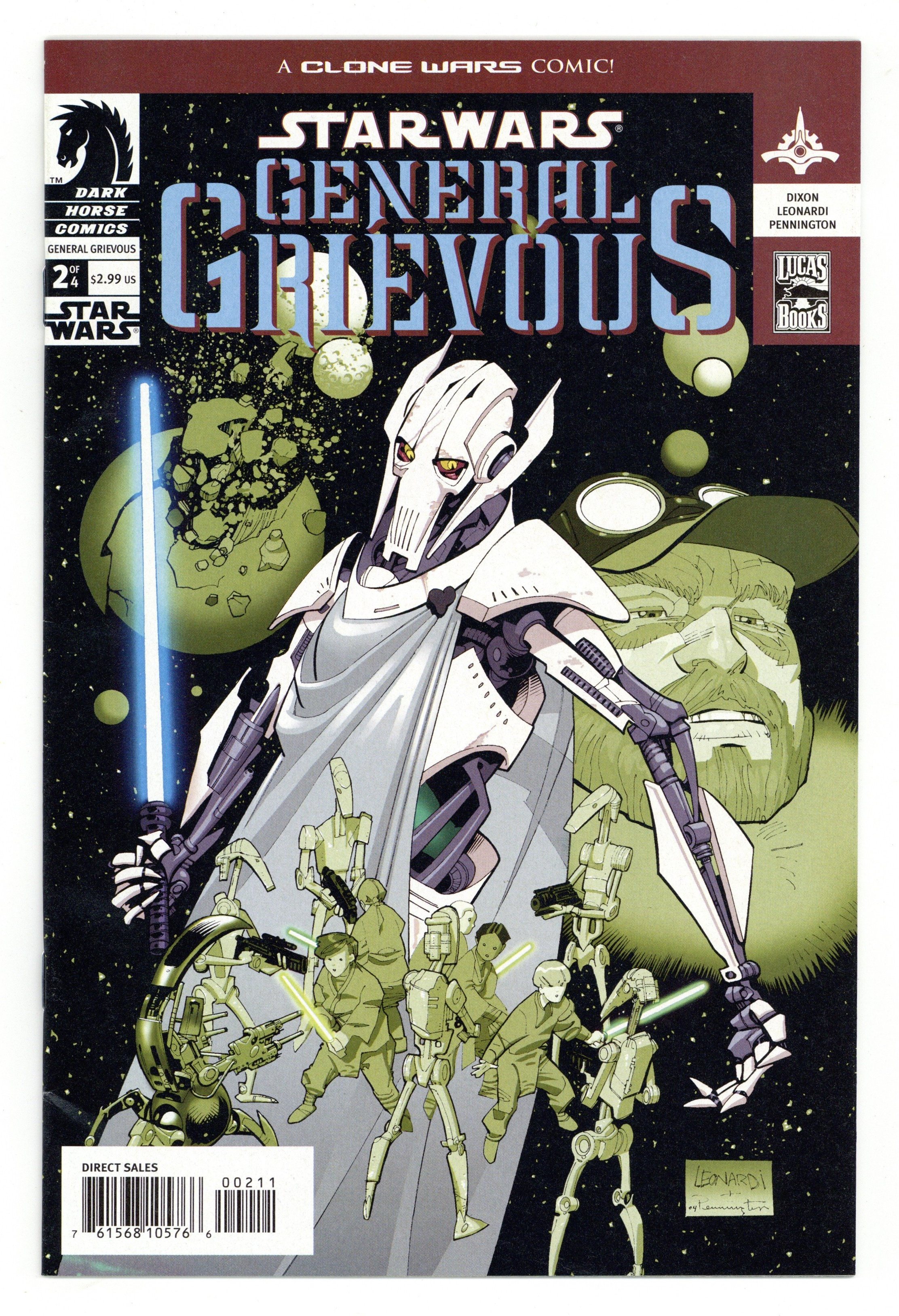 Tags: Star WarsPublished Apr 2005 by Dark Horse.$18.00CHUCK DIXON (W), RICK LEONARDI (P), MARK PENNINGTON (I), and LUCAS MARANGON (C) On sale April 20, FC, 32pg, $2.99 General Grievous and his forces invade the planet Gentes and take it's population and their production facilities as trophies of war. Meanwhile, Flynn Kybo and the Jedi, who seek to kill Grievous, team up with a grizzled band of space miners who hope to see Grievous dead as well. But they're unaware that the General holds hostage a group of Padawan children captured during a raid on a Republic fleet. And what Grievous has planned for the Padawans is a fate far worse than death... ? Look for our complete Star Wars backlist beginning on page 00. Cover price $2.99.