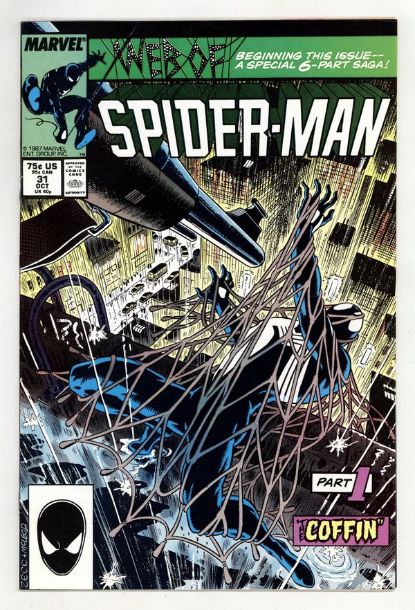 Direct Edition. Kraven's Last Hunt - Part 1 of 6 - "The Coffin" Story by J. M. DeMatteis. Art by Mike Zeck and Bob McLeod. This is the first issue of the Kraven's Last Hunt storyline. A deranged Kraven begins his final quest to exterminate Spider-Man. He ambushes the web-slinger and successfully captures him. Now it appears that a comatose Spider-Man has been buried alive. The situation does not look good. Story continues in Amazing Spiderman 293. 32 pages Cover price $0.75.