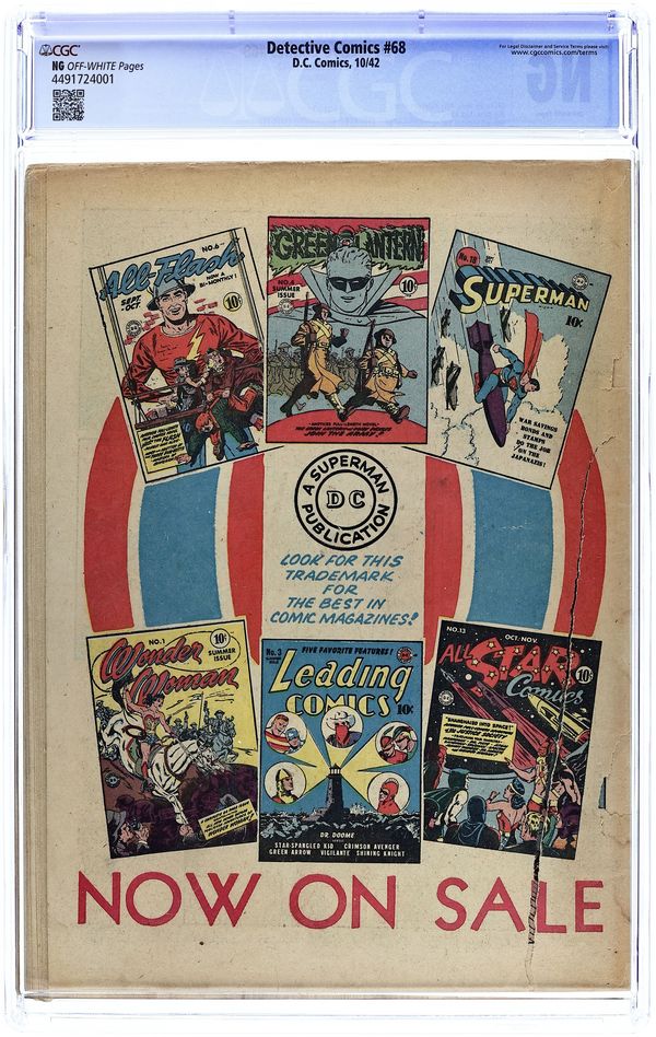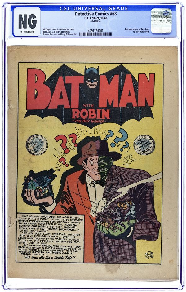 First Two-Face cover by Jerry Robinson. The Man Who Led a Double Life starring Batman, Robin, and Two-Face, script by Bill Finger, pencils by Bob Kane, inks by Jerry Robinson and George Roussos. The Treachery of Osuki starring The Boy Commandos, script and pencils by Jack Kirby, inks by Joe Simon. Dead Men Do Tell Tales starring The Crimson Avenger, script and pencils by Jack Lehti, inks by Charles Paris. Adventure of the Peglegged Wildcat starring Spy, pencils by Pierce Rice, inks by Arturo Cazeneuve. Escape from Death text story by Nils Hall. The Case of the Talking Gun starring Air Wave, script by Murray Boltinoff, pencils by Harris Levy (as Lee Harris), inks by Charles Paris. The Case of the Cultured Crooks starring Slam Bradley, art by Howard Sherman. 68 pgs. $0.10. Cover price $0.10.
