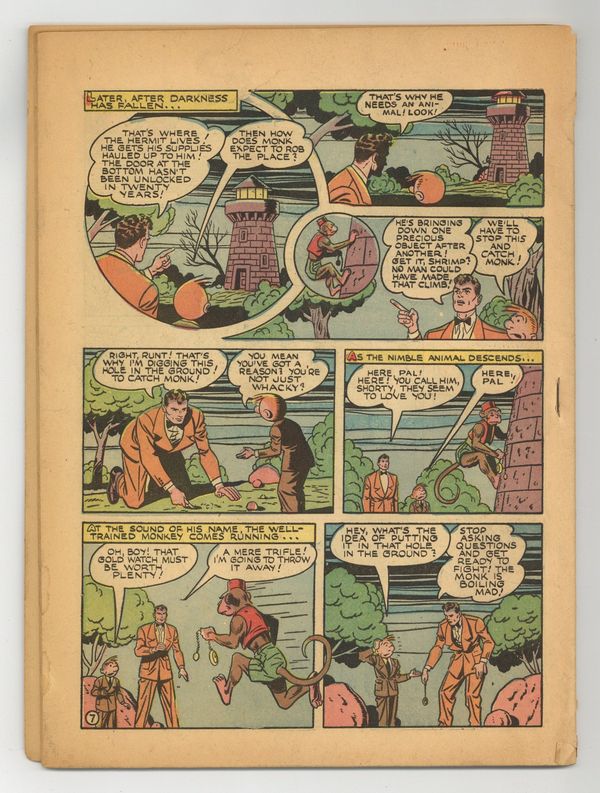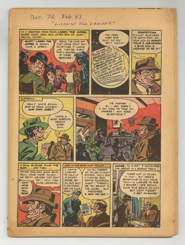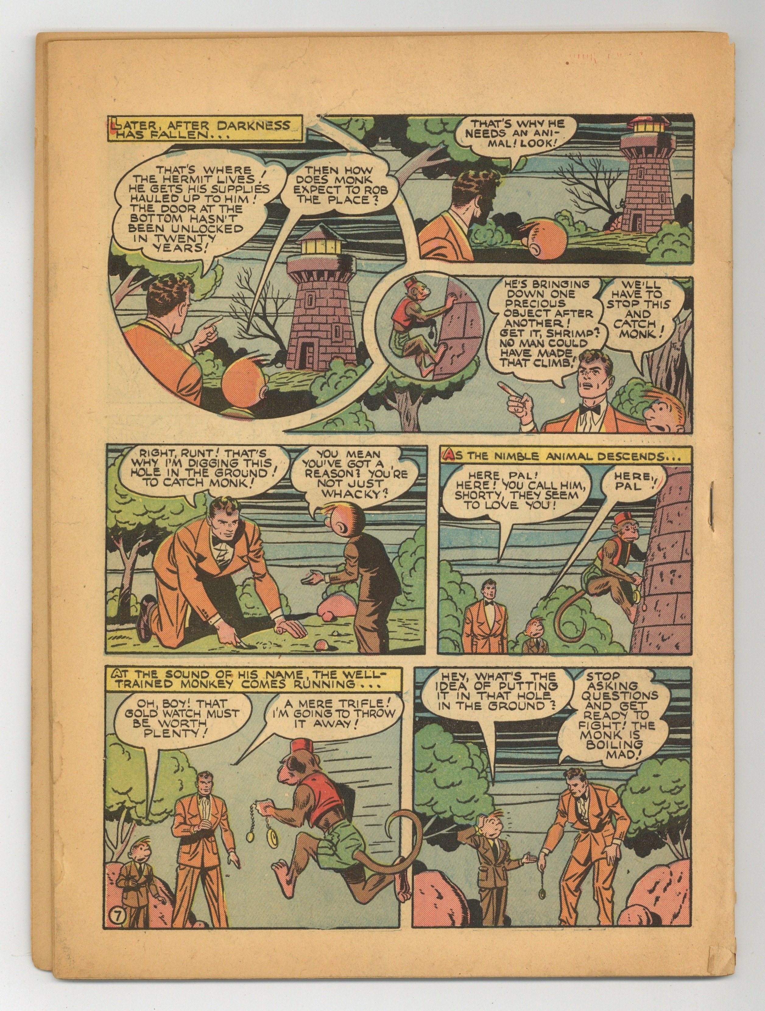 Cover art by Jerry Robinson. License for Larceny starring Batman and Robin, script by Joe Samachson, pencils by Bob Kane, inks by Jerry Robinson and George Roussos. Petals of Peril starring The Boy Commandos, script and pencils by Jack Kirby, inks by Joe Simon. The Adventure of the Wrong Numbers starring The Crimson Avenger, script and pencils by Jack Lehti, inks by `Charles Paris. The Target Murder starring Spy, art by Chuck Winter. Baptism of Fire text story by Tex Denton. Larry Jordan vs. Air Wave, script by Murray Boltinoff, pencils by Harris Levy (as Lee Harris), inks by Charles Paris. The Mystery of the Missing Monkey starring Slam Bradley, art by Howard Sherman. 68 pgs. $0.10. Cover price $0.10.