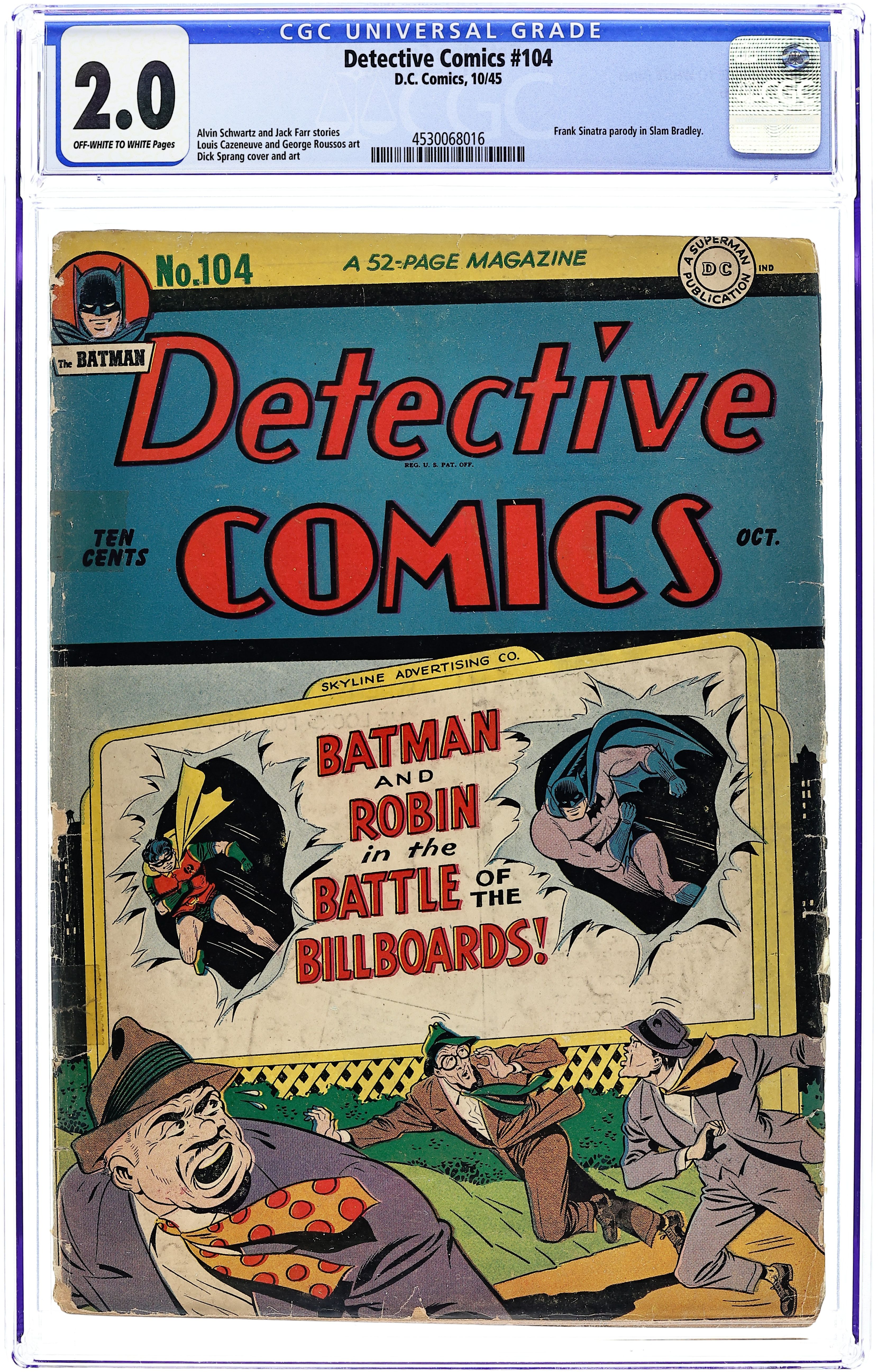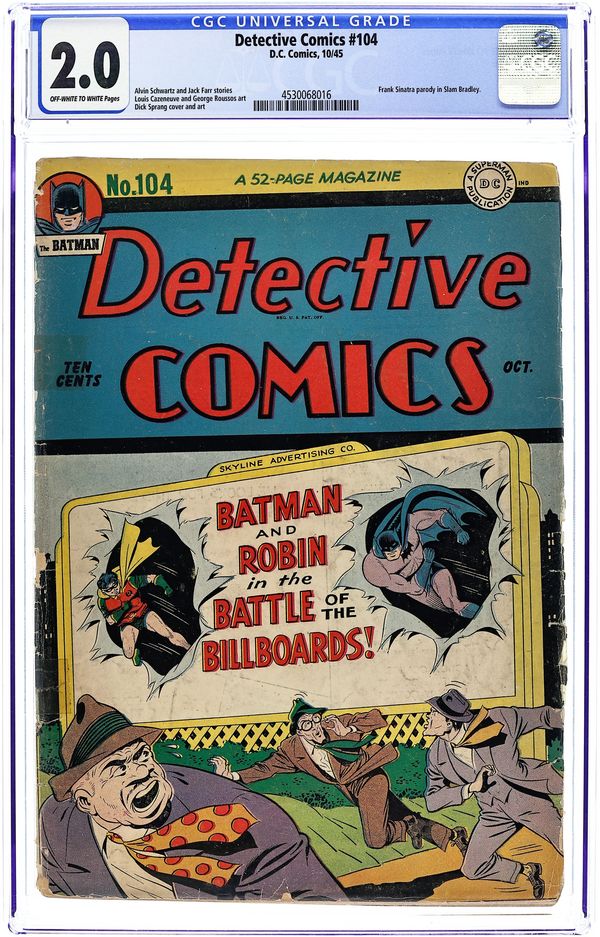 Cover by Dick Sprang. Stories by Alvin Schwartz, Jack Farr and unknown. Art by Dick Sprang, Jack Farr, Howard Sherman, George Roussos and Louis Cazeneuve. Batman turns the tables on some crooks who are using giant billboards to blackmail people in the Batman and Robin tale "The Battle of the Billboards!" by Alvin Schwartz and Dick Sprang. Plus: Three-Ring Binks in an untitled story by Jack Farr; Slam Bradley in "The Buzzard and the Screech!" with art by Howard Sherman; Air Wave in "Swag That Stole Itself!" with art by George Roussos; and The Boy Commandos in "The Crooked Ghost!" with art by Louis Cazeneuve. Also: 2-page text story "Clear Sailing" by Alton Black, and Scuffy the Tramp 1-pager by Lit-Win. 52 pages, full color. Cover price $0.10.