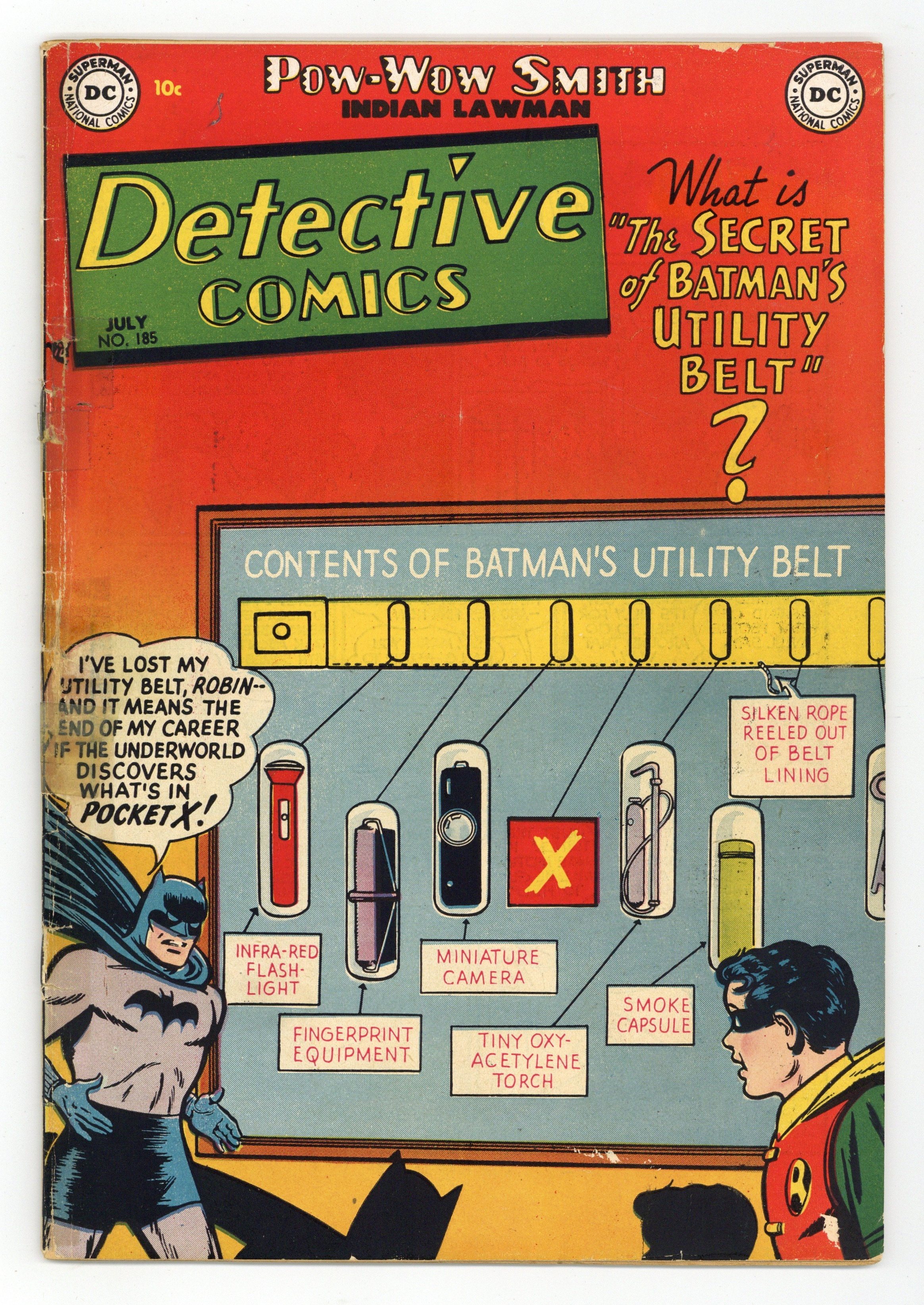 Cover by Win Mortimer. Stories by unknown. Art by Dick Sprang, Charles Paris, Leonard Starr, Ruben Moreira and unknown. Batman's lost his utility belt...and it means the end of his career if the underworld discovers what's in pocket X! Don't miss Batman and Robin in "The Secret of Batman's Utility Belt!" with art by Dick Sprang and Charles Paris. Plus: Pow-Wow Smith, Indian Lawman in "The Man Who Killed Pow-Wow Smith!" with art by Leonard Starr; Robotman in "The Three Impostors!"; and Impossible -- But True! tale "The Case of the Modern Aladdin!" (featuring Roy Raymond) with art by Ruben Moreira. Also: 2-page text piece "He Foresaw Wonders" by David Kahn. 44 pages, full color. Cover price $0.10.