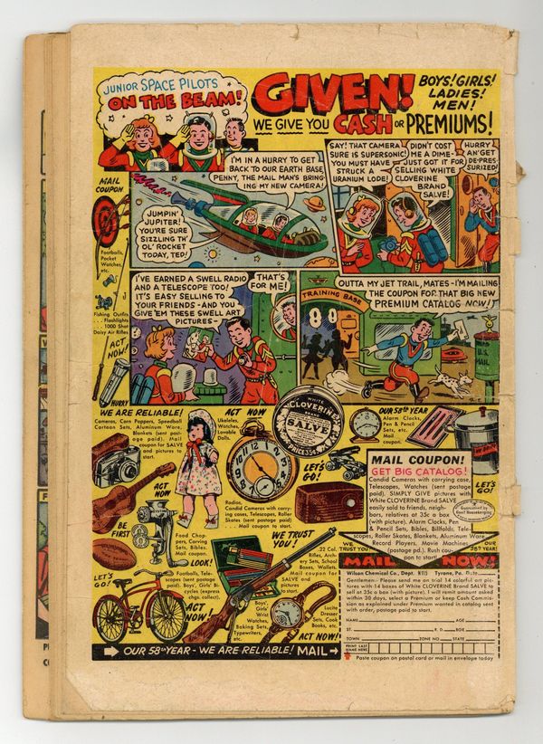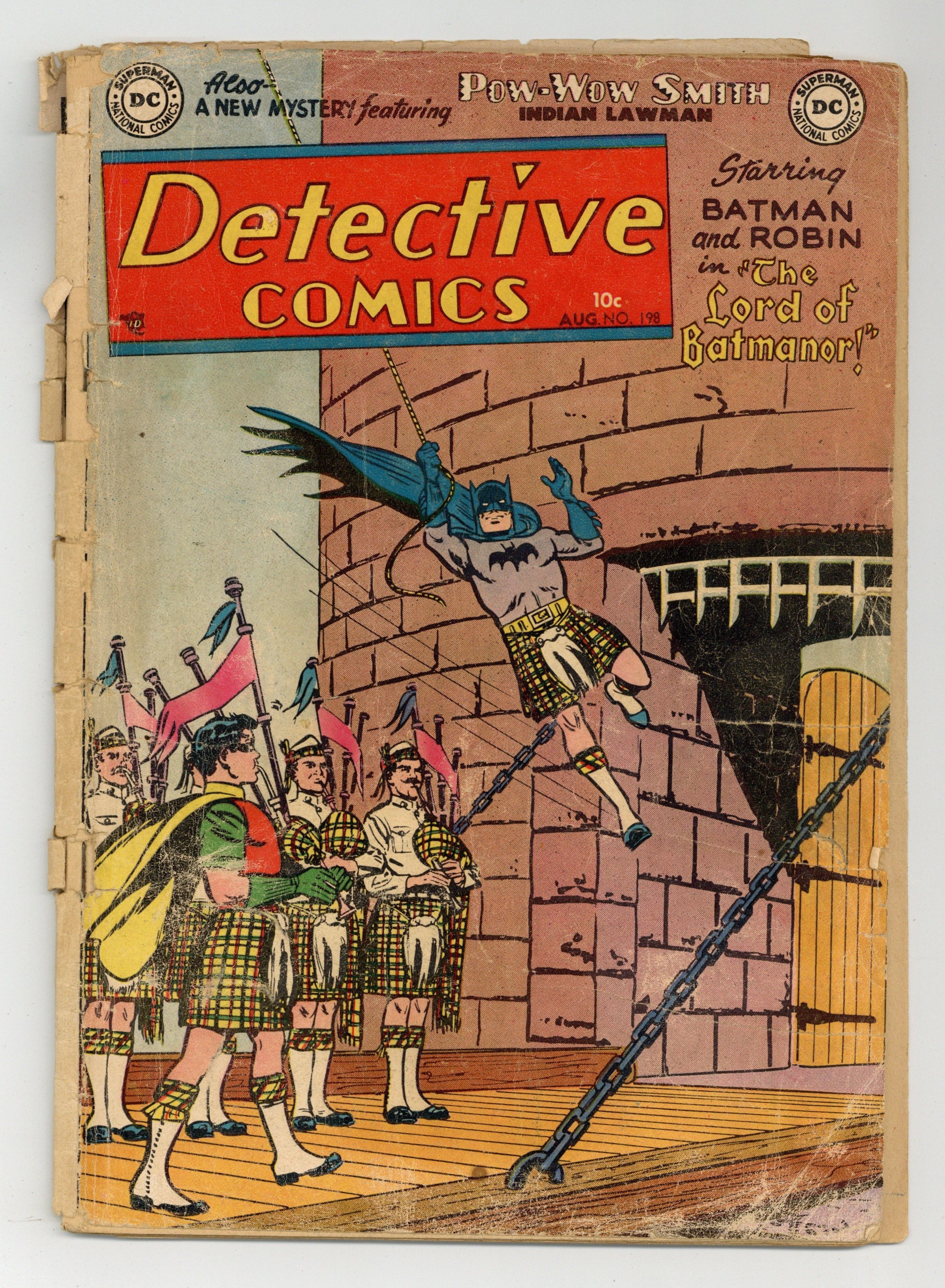 Cover by Win Mortimer. Stories by Leigh Brackett, Edmond Hamilton and unknown. Art by Dick Sprang, Charles Paris, Leonard Starr, Joe Certa and Ruben Moreira. The dying Lord of Batmanor in Scotland wills the castle to Batman, so the Dynamic Duo make their way to Scotland to claim the castle, and end up solving a 400-year-old mystery in the process. Don't miss Batman and Robin in "The Lord of Batmanor!" by Leigh Brackett, Edmond Hamilton, Dick Sprang and Charles Paris. Plus: Pow-Wow Smith, Indian Lawman in "Bring in Pow-Wow Smith Dead!" with art by Leonard Starr; Robotman in "Robotman -- On the Loose!" with art by Joe Certa; and Impossible -- But True! tale "Destination -- Mars!" (featuring Roy Raymond) with art by Ruben Moreira. Also: 2-page text piece "Witness on Wire," and Casey the Cop 1-pager by Henry Boltinoff. 44 pages, full color. Cover price $0.10.