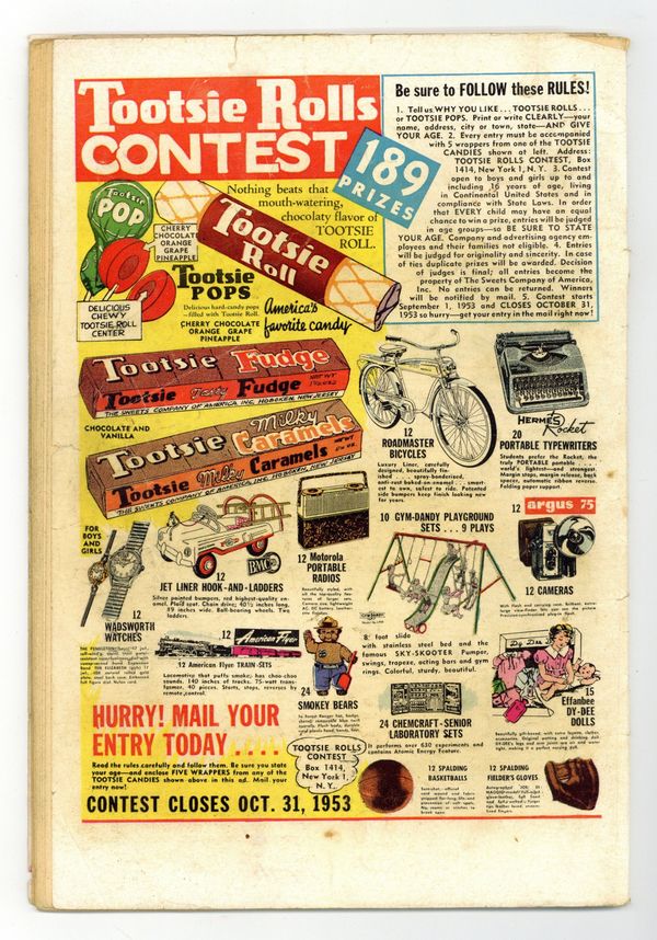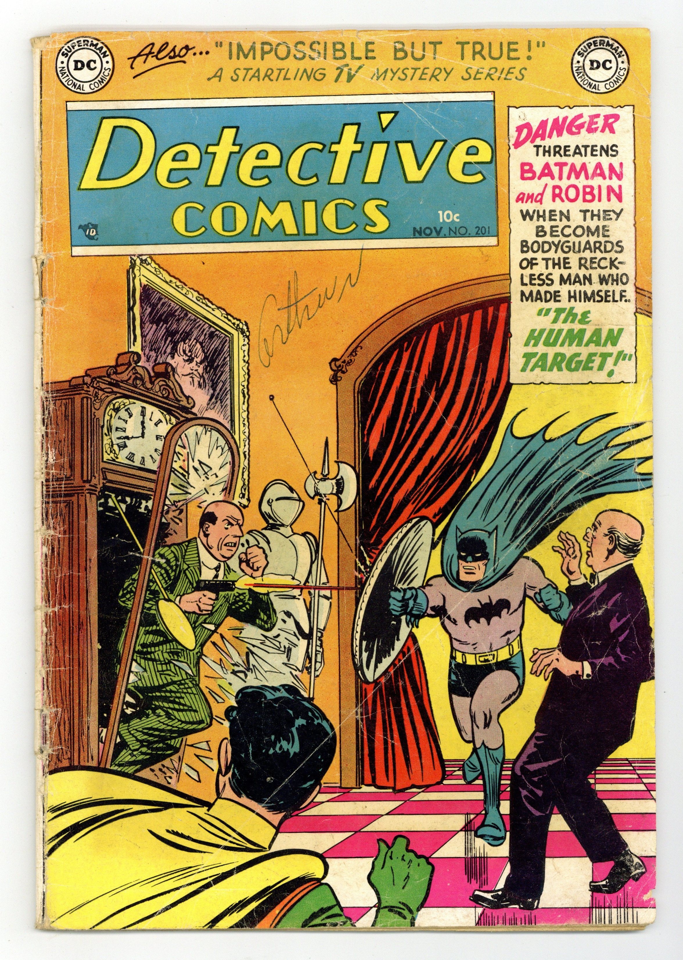 Cover art by Win Mortimer. United Nations Day, October 24th public service announcement, script by Jack Schiff, art by Win Mortimer. The Human Target starring Batman and Robin, script by Edmond Hamilton, pencils by Sheldon Moldoff, inks by Charles Paris. Riddle of the Unseen Man starring Roy Raymond TV Detective, art by Ruben Moreira. Safety-First Robot starring Robotman, art by Joe Certa. Convict Without a Number text article by Jack Miller. Deadline in Red Deer Valley starring Pow-Wow Smith, Indian Lawman, art by Leonard Starr (Craig Delich). 44 pgs. $0.10. Cover price $0.10.