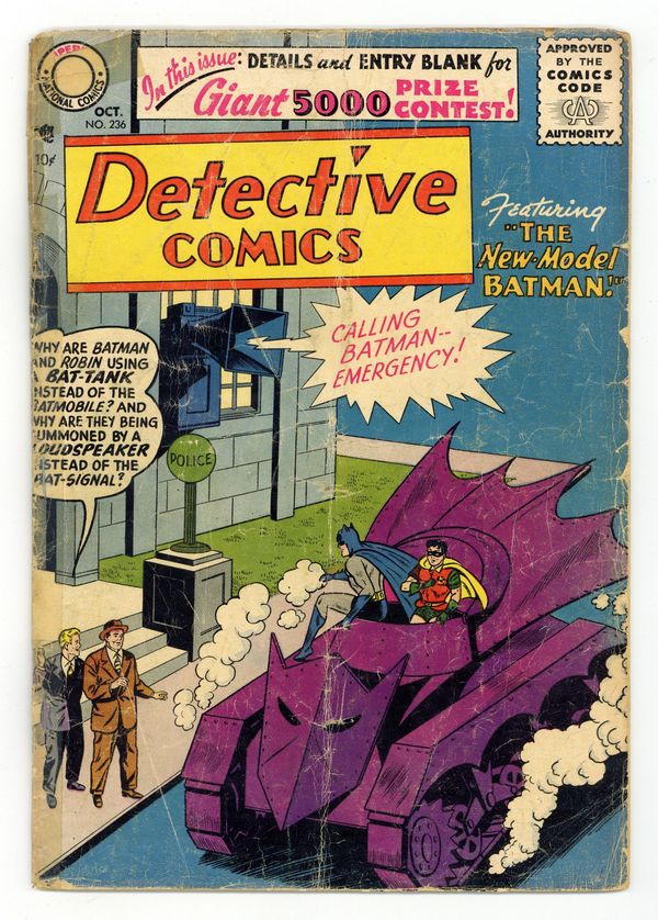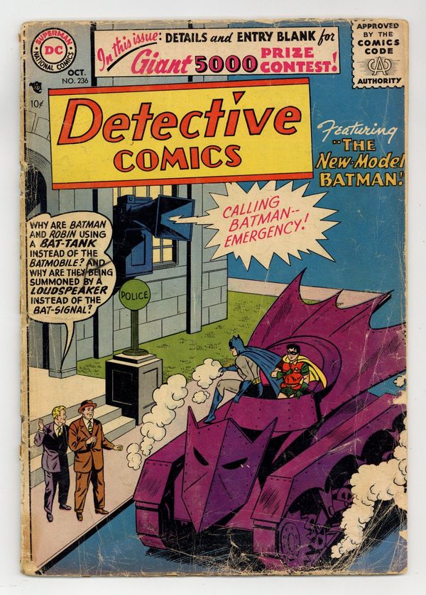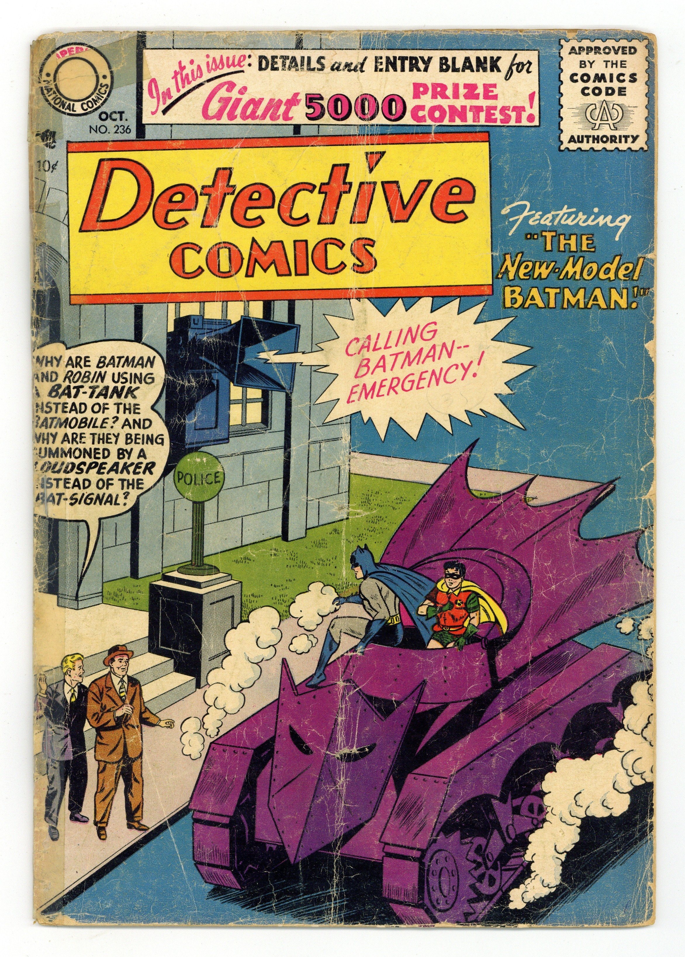 Cover art by Sheldon Moldoff. 1st appearance of the Bat-Tank in The New-Model Batman starring Batman and Robin. How to Spend a Summer Week! starring Binky, script by Jack Schiff, art by Win Mortimer. The Great Earth-Mars Mystery starring John Jones Manhunter from Mars, art by Joe Certa. The Magic Tablecloth starring Roy Raymond TV Detective, script by Jack Miller, art by Ruben Moreira. 36 pgs. $0.10. Cover price $0.10.