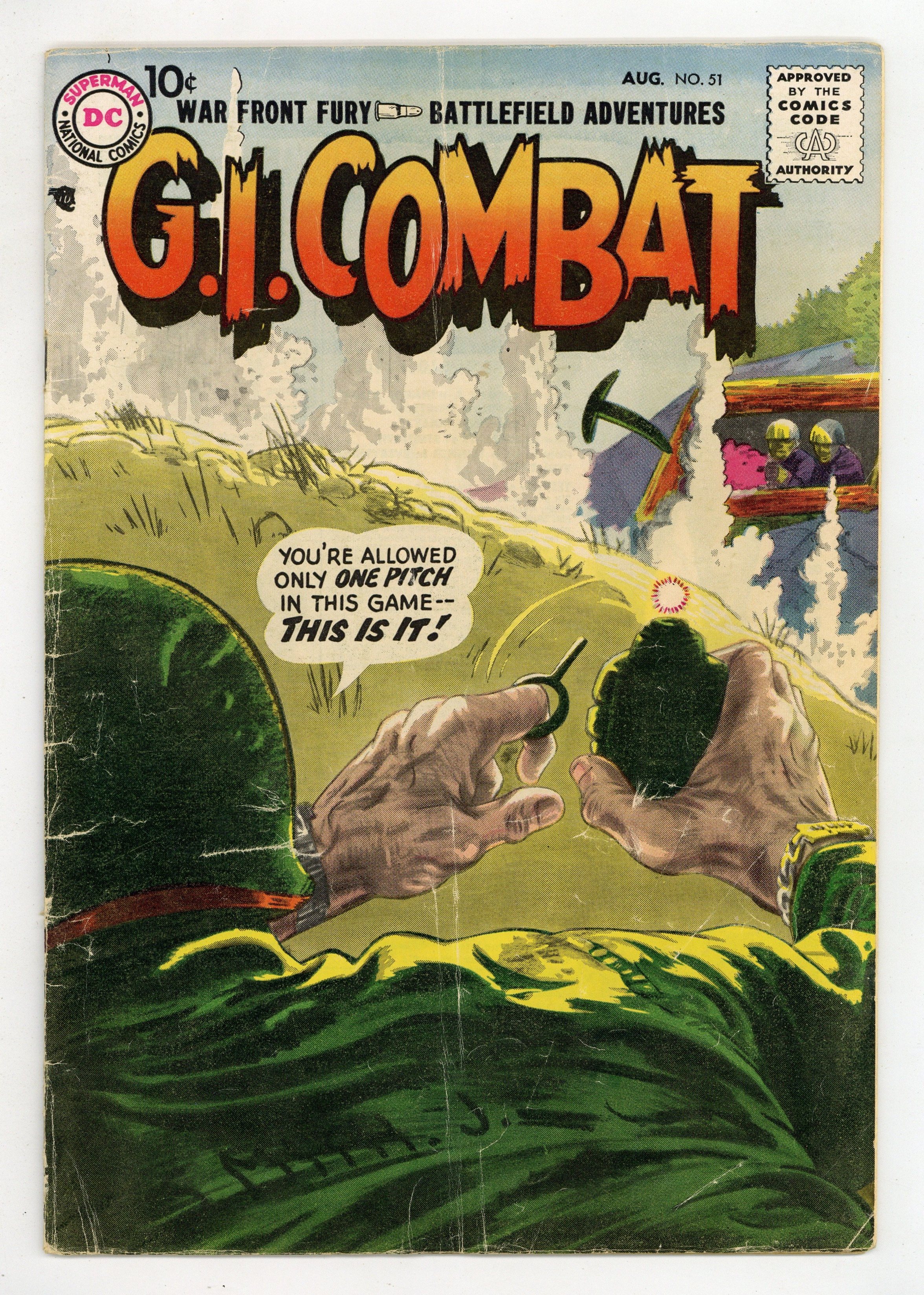 Cover by Jerry Grandenetti. Written by Robert Kanigher, Bill Finger, Ed Herron and Bob Haney. Art by Jerry Grandenetti, Ross Andru, Irv Novick, Russ Heath and Mike Esposito. War front fury! Battlefield adventures! You're allowed only one pitch in this game...and this is it! Don't miss..."The Walking Grenade!" by Robert Kanigher and Jerry Grandenetti. Also in this issue: "Desert Stand!" by Bill Finger, Ross Andru and Mike Esposito; "Bunker Hill Beachhead!" by Ed Herron and Irv Novick; and "Jump-Off Town!" by Bob Haney and Russ Heath. 36 Pages, Full Color. Cover price $0.10.