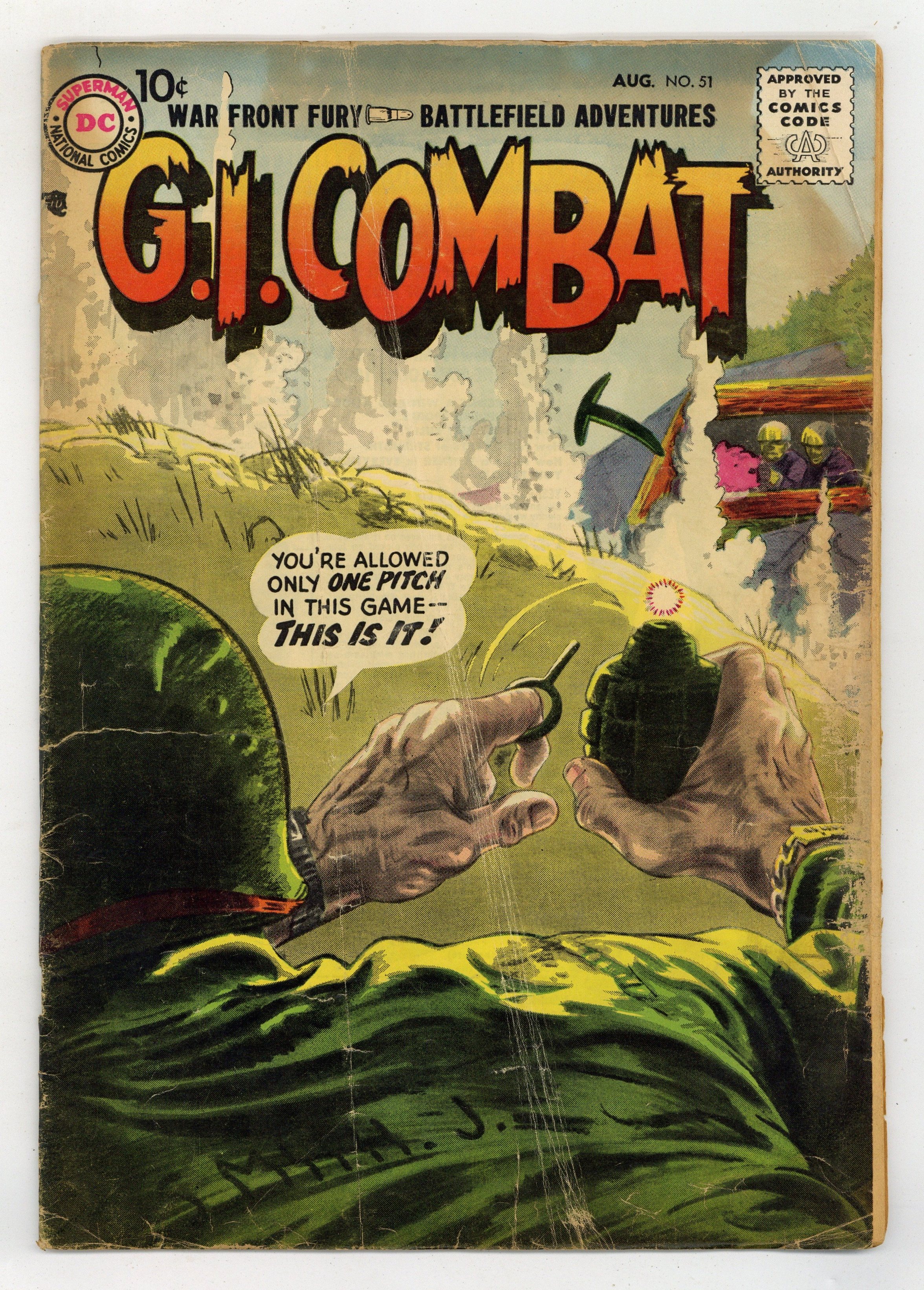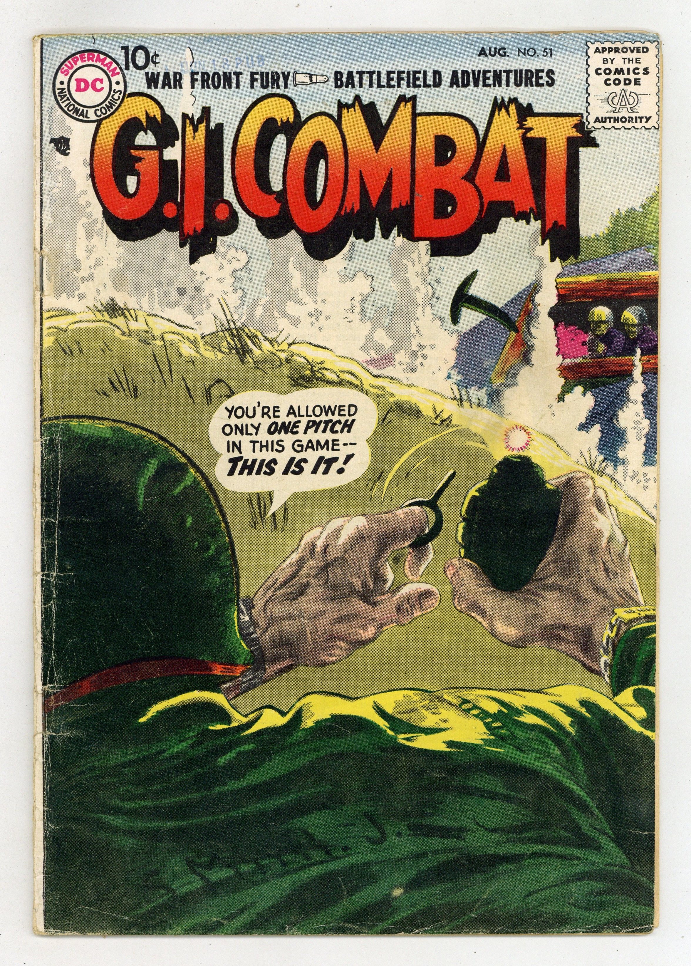 $32.00Cover by Jerry Grandenetti. Written by Robert Kanigher, Bill Finger, Ed Herron and Bob Haney. Art by Jerry Grandenetti, Ross Andru, Irv Novick, Russ Heath and Mike Esposito. War front fury! Battlefield adventures! You're allowed only one pitch in this game...and this is it! Don't miss..."The Walking Grenade!" by Robert Kanigher and Jerry Grandenetti. Also in this issue: "Desert Stand!" by Bill Finger, Ross Andru and Mike Esposito; "Bunker Hill Beachhead!" by Ed Herron and Irv Novick; and "Jump-Off Town!" by Bob Haney and Russ Heath. 36 Pages, Full Color. Cover price $0.10.