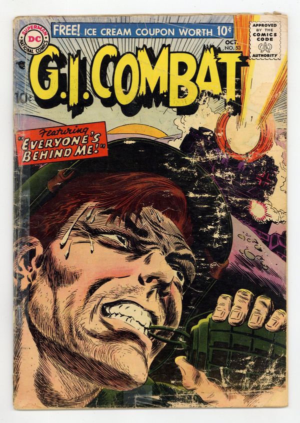 $38.00Cover by Jerry Grandenetti. Written by Ed Herron, Bill Finger and Robert Kanigher. Art by Joe Kubert, Jack Abel, Jerry Grandenetti, Carmine Infantino and Robert Stuart. In this issue: "The Paper Trap!" by Ed Herron and Joe Kubert; "Battle Pattern!" by Bill Finger and Jack Abel; "Infantry Town!" by Herron and Jerry Grandenetti; "Everyone's Behind Me!" by Robert Kanigher, Carmine Infantino and Robert Stuart; and 1-pager "Fighting Fifth Cavalry Regiment!" 36 Pages, Full Color. Cover price $0.10.