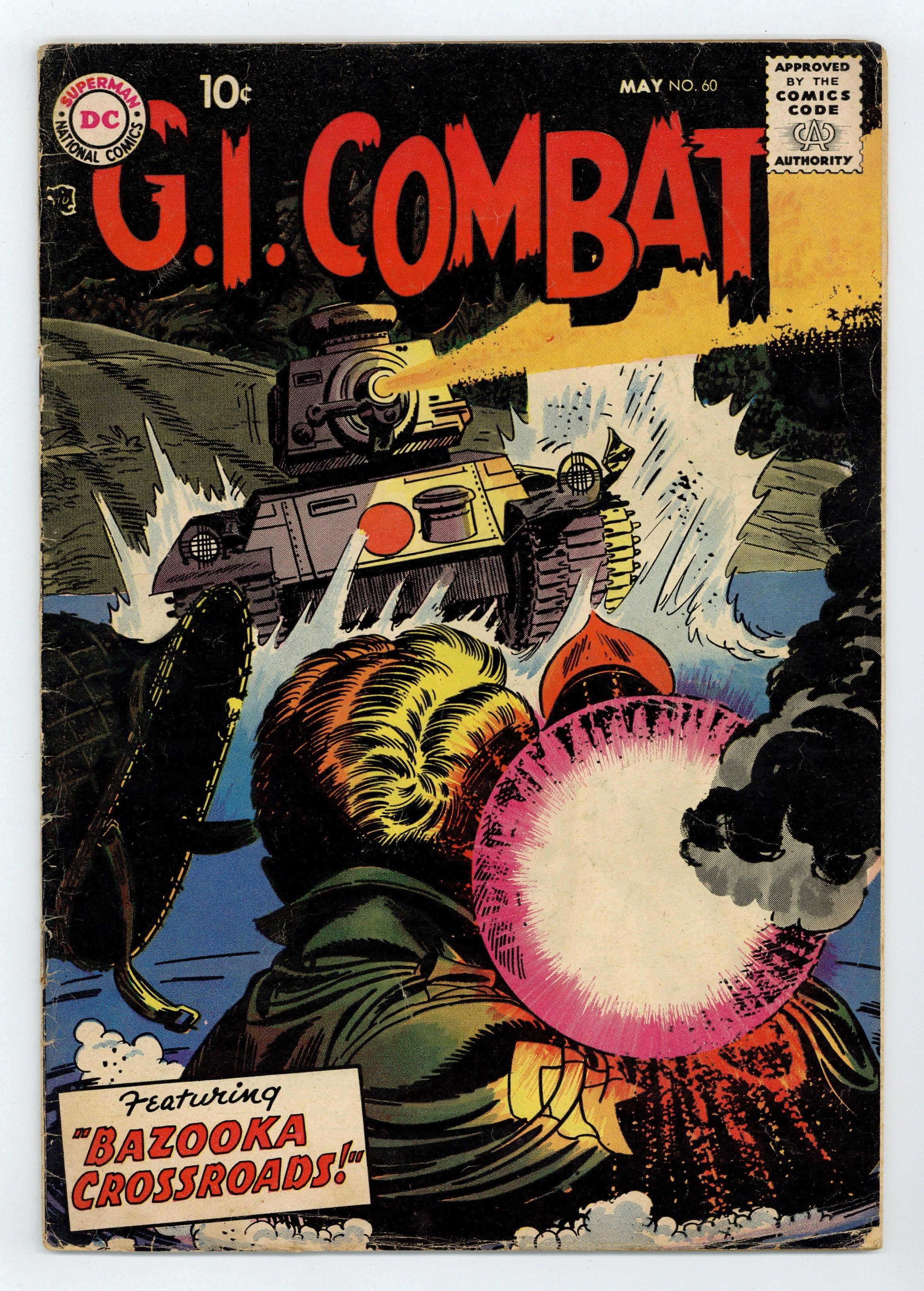 Cover by Jerry Grandenetti. Written by Robert Kanigher, Bill Finger and Bob Haney. Art by Ross Andru, Jack Abel, Russ Heath and Mike Esposito. In this issue: "Bazooka Crossroads!" by Robert Kanigher, Ross Andru and Mike Esposito; "Long Tom and Little Tom!" by Bill Finger and Jack Abel; "Frogman S.O.S.!" by Bob Haney and Russ Heath; and 1-pager "Courage Without Fear!" Also: Full-page ad for New Adventures of Charlie Chan (1958) #1. 36 Pages, Full Color. Cover price $0.10.