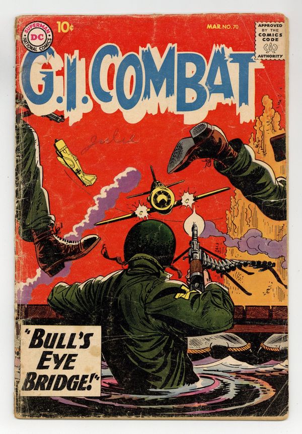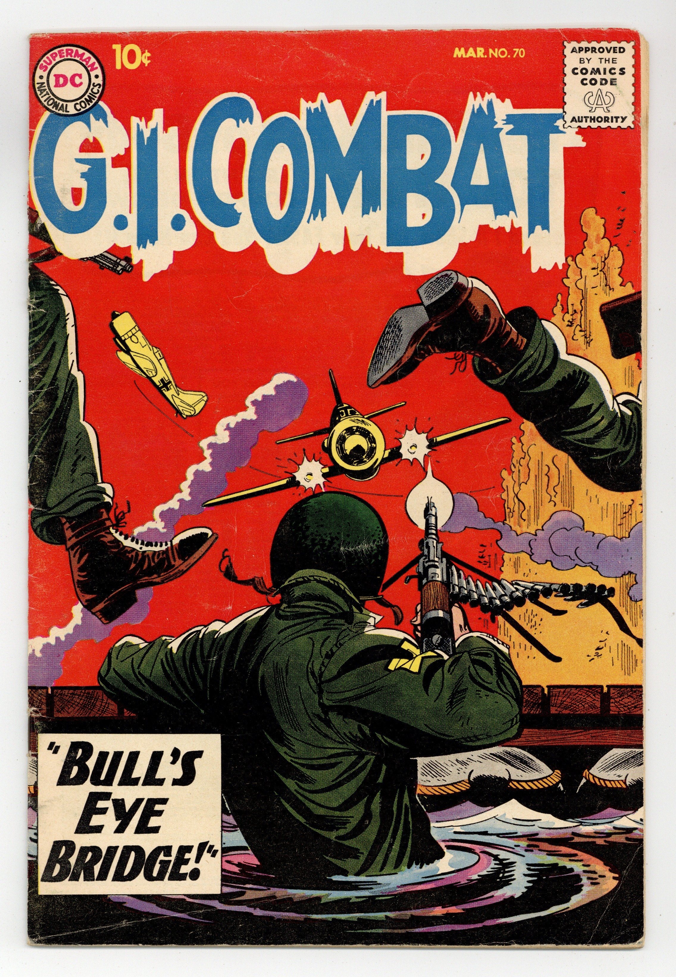 Cover by Jerry Grandenetti. Written by Robert Kanigher and Bob Haney. Art by Joe Kubert, Jerry Grandenetti, Ross Andru and Mike Esposito. "The Hot Spot!" by Robert Kanigher and Joe Kubert features a look at where the 'Hot Spot' in a war really is, from the perspectives of a pilot, a frogman, and a group of foot soldiers. Plus: "The Battle Look!" by Bob Haney and Jerry Grandenetti features a confrontation between a GI and three enemy soldiers, jumping back and forth from a "What does the GI see?" to a "What does the enemy see?" perspective. Also: Without a bridge to help the infantry cross a river, they're all just sitting on a bull's eye. And as soon as they get the bridge up, the enemy takes it down. The important thing is to do it one more time than they do in "Bull's-Eye Bridge!" by Kanigher, Ross Andru and Mike Esposito. And: 1-pager "Forward!" 36 Pages, Full Color. Cover price $0.10.