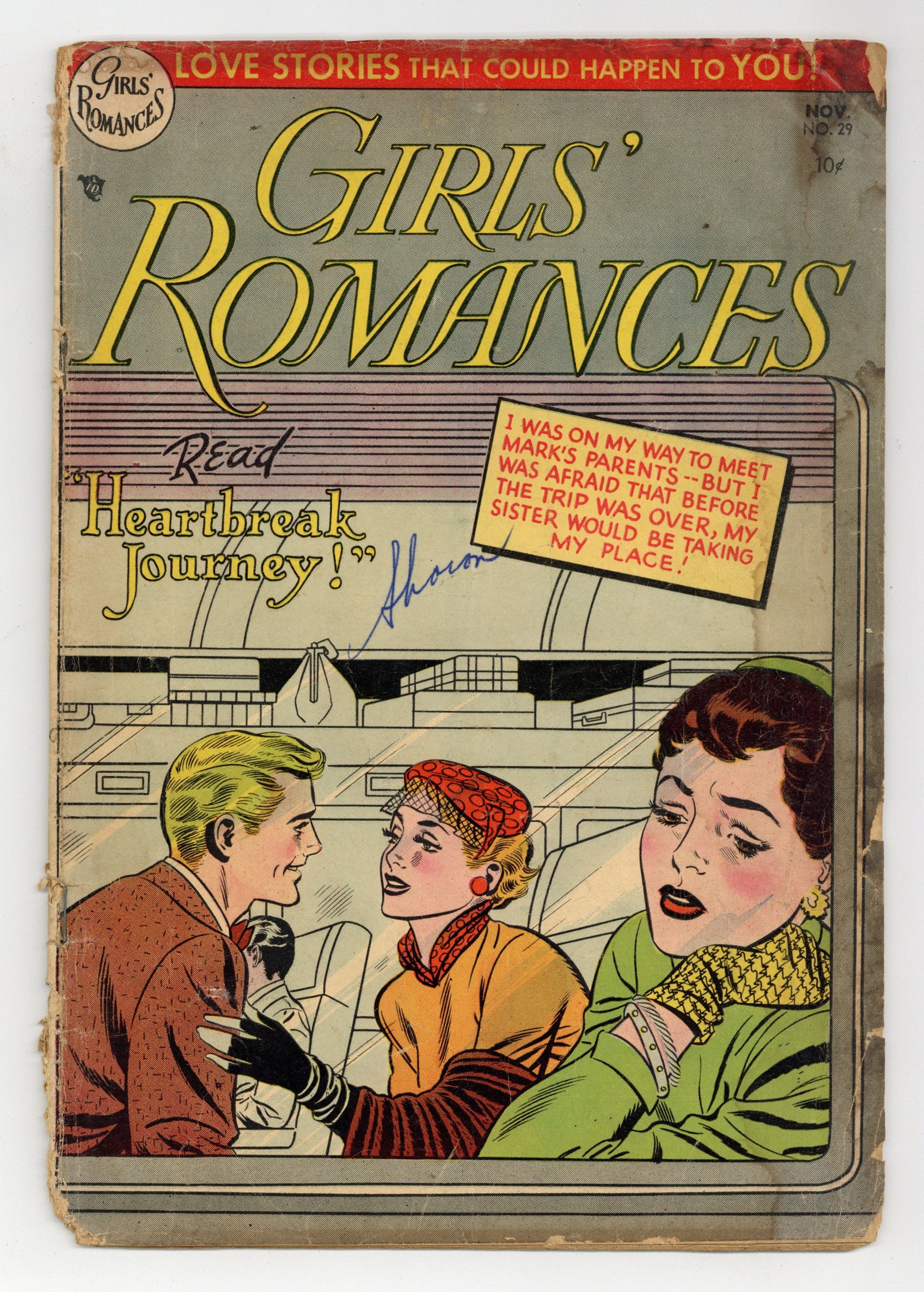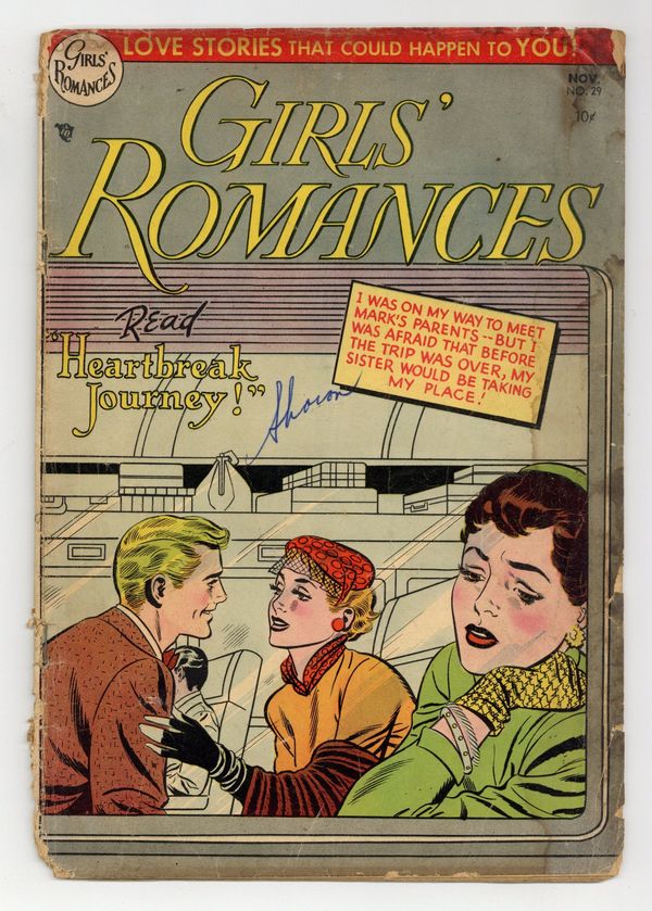 She was on her way to meet Mark's parents...but she was afraid that before the trip was over, her sister would be taking her place! "Heartbreak Journey!" is the cover-featured 8 page story. Plus: 8 page story "Another Woman's Man!"; 6 page story "Time for Tears" drawn by Gil Kane and Bernard Sachs; 2 page Julia Roberts' Romance Report letters page; 7 page story "Lost Moment" drawn by Sid Greene; 1 page Oddities in Romance filler drawn by Mort Drucker. Cover price $0.10.