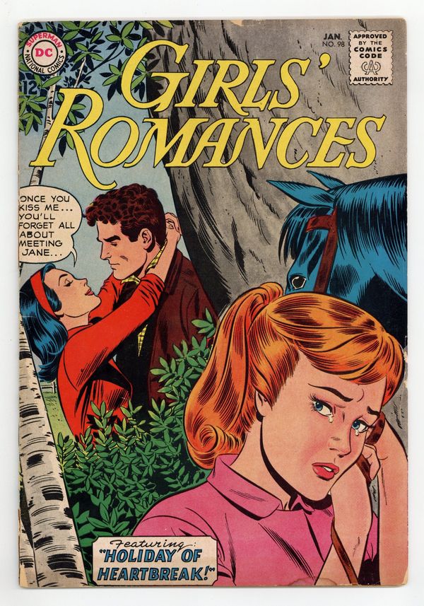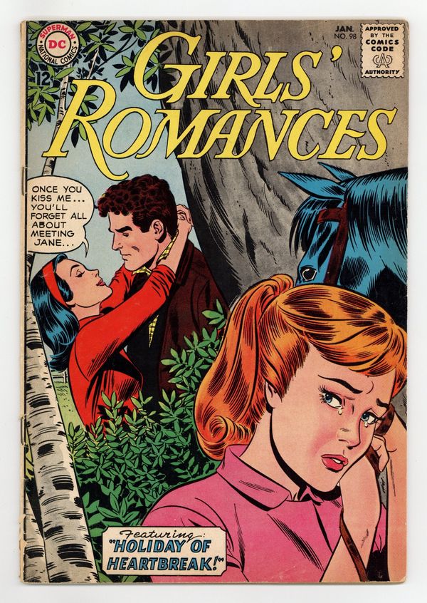 Once he kissed her...he would forget all about meeting Jane! "Holiday of Heartbreak" is the cover-featured 8 page story. Plus: 8 page story "I Would Never Find Love"; 8 page story "Wait for Me"; 7 page story "Someday, Maybe -- !"; 1 page Julia Roberts, Romance Counselor letters page. Cover pencils by John Romita, Sr. Cover price $0.12.