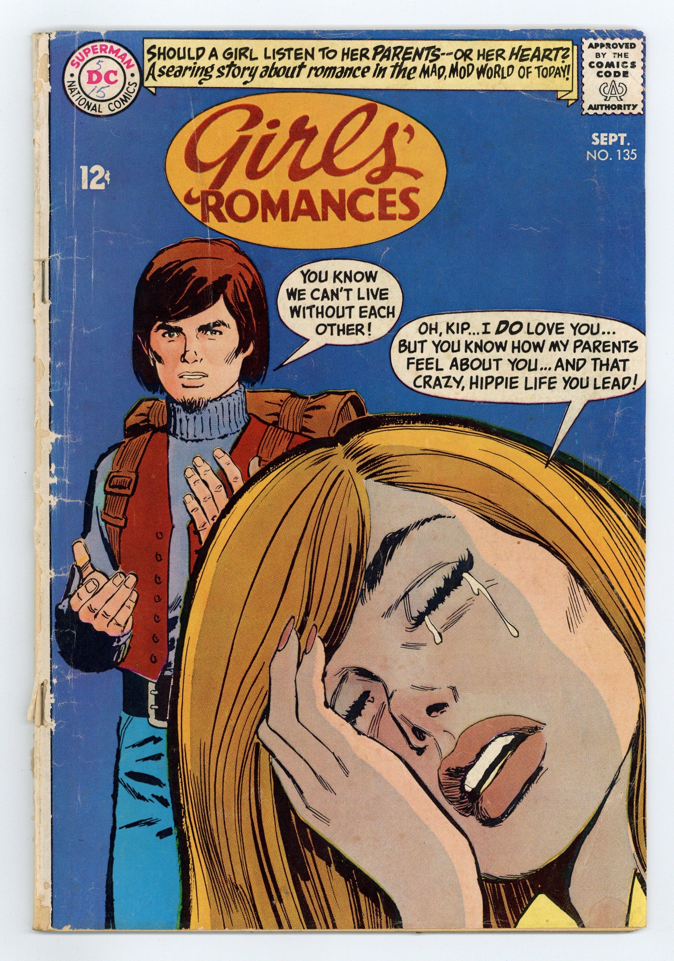 Cover pencils by Jay Scott Pike. When Love Goes Away, pencils by John Rosenberger; A terrible auto accident renders Rick blind; He meets Jen, a blind girl, at the Mitter School for the Blind. A Day for Tears, pencils by Mike Sekowsky, inks by Bernard Sachs; Joan discovers Alice, an old girlfriend, is about to be married. Mad Mad Modes for Moderns fashions, pencils by Jay Scott Pike. Lonely Heart, pencils by Tony Abruzzo; Peggy flies to Paris looking for excitement; She meets Nick; He wants to do a story on an American girl's first trip to Paris. Julia Roberts Romance Counselor advice column. My Time to Love (Part I), pencils by Jay Scott Pike; Karen wants Kip to give up his hippie life, return to college, and become a sensible, responsible man, but Kip has taken a job with a band and wants Karen to travel with him. 36 pgs. $0.12. Cover price $0.12.