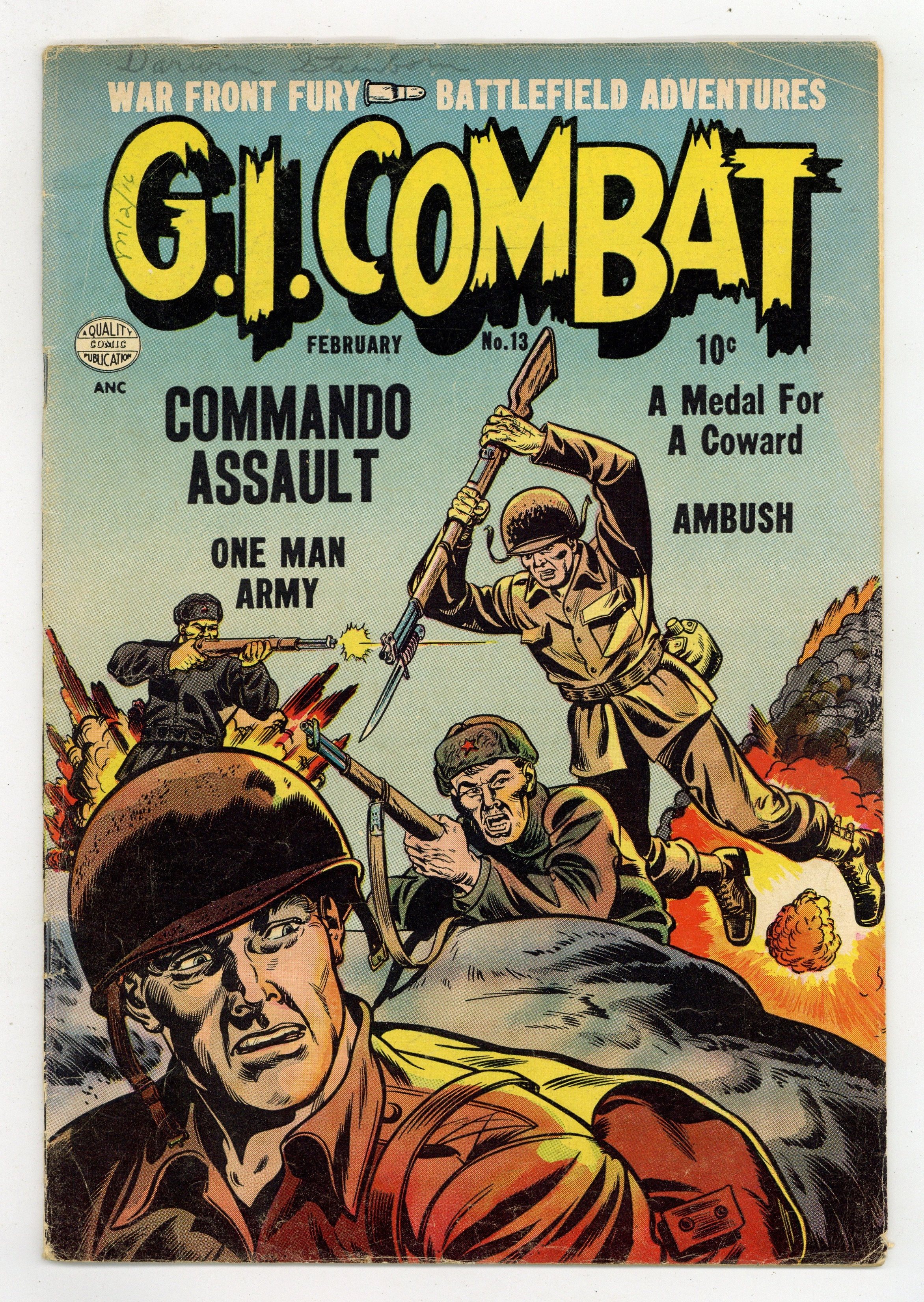 February 1954: Cover by Dick Dillin and Charles Cuidera; "Commando Assault," 9 pages, art by Dillin and Cuidera; "One Man Army, 6 pages; "A Medal for a Coward," 7 pages; "Escape at Dawn," 1 page text story; "Ambush," 6 pages. 36 Pages, Full Color. Cover price $0.10.