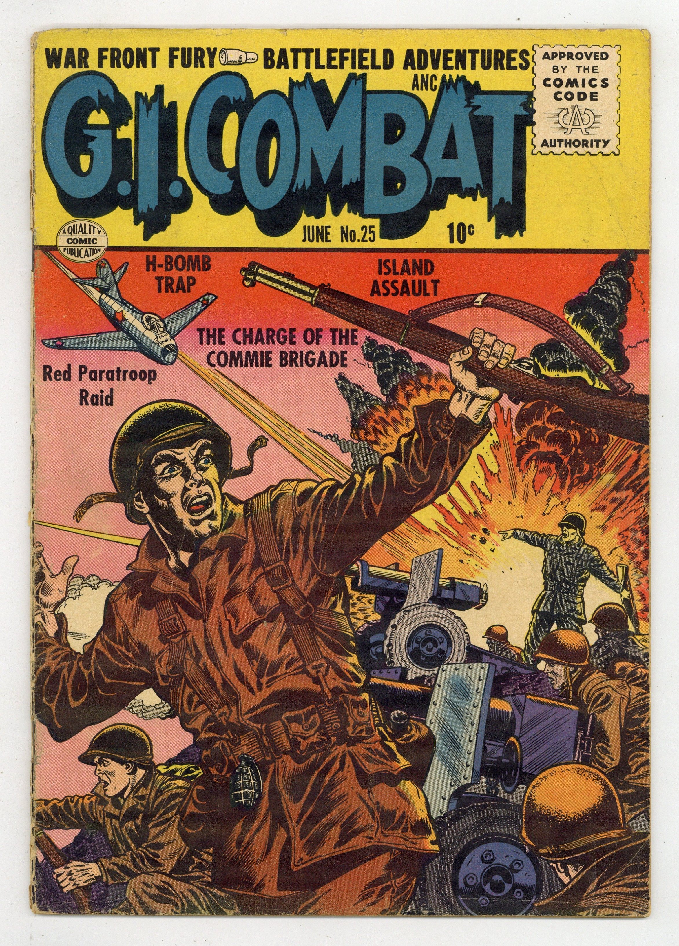 Cover by Dick Dillin and Chuck Cuidera. Written by unknown. Art by Charles Nicholas, Dick Dillin, Chuck Cuidera and unknown. War front fury! Battlefield adventures! In this issue: "The Charge of the Commie Brigade," with pencils by Charles Nicholas; "H-Bomb Trap," with pencils by Dick Dillin; "Red Parachute Raid," with art by Nicholas and Chuck Cuidera; 1-page text story "Airborne Adventure"; and "Island Assault"! 36 Pages, Full Color. Cover price $0.10.