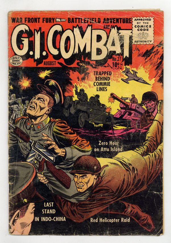 Cover by Dick Dillin? and Chuck Cuidera. Written by unknown. Art by Charles Nicholas and unknown. War front fury! Battlefield adventure! In this issue: "Last Stand in Indochina," with pencils by Charles Nicholas; "Red Helicopter Raid"; "Trapped Behind Commie Lines," with pencils by Nicholas; 1-page text story "Vengeance!"; and "Zero Hour on Attu Island"! 36 Pages, Full Color. Cover price $0.10.
