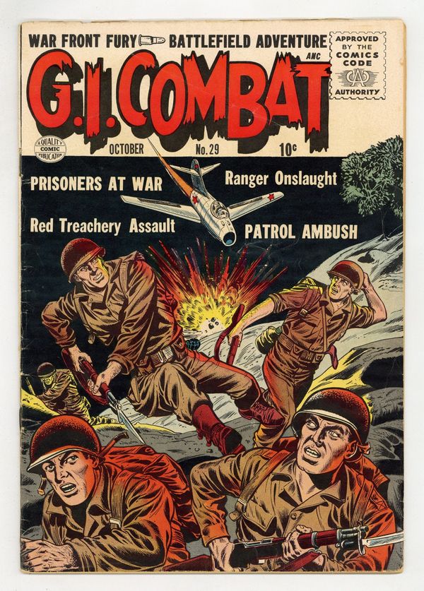 $35.00Cover by Dick Dillin and Chuck Cuidera. Written by unknown. Art by Charles Nicholas, Sid Greene? and unknown. War front fury! Battlefield adventure! In this issue: "Prisoners at War," with pencils by Charles Nicholas; "Red Treachery Assault"; "Ranger Onslaught," with pencils by Nicholas; 1-page text story "Plan for Doom"; and "Patrol Ambush," with art by Sid Greene? 36 Pages, Full Color. Cover price $0.10.