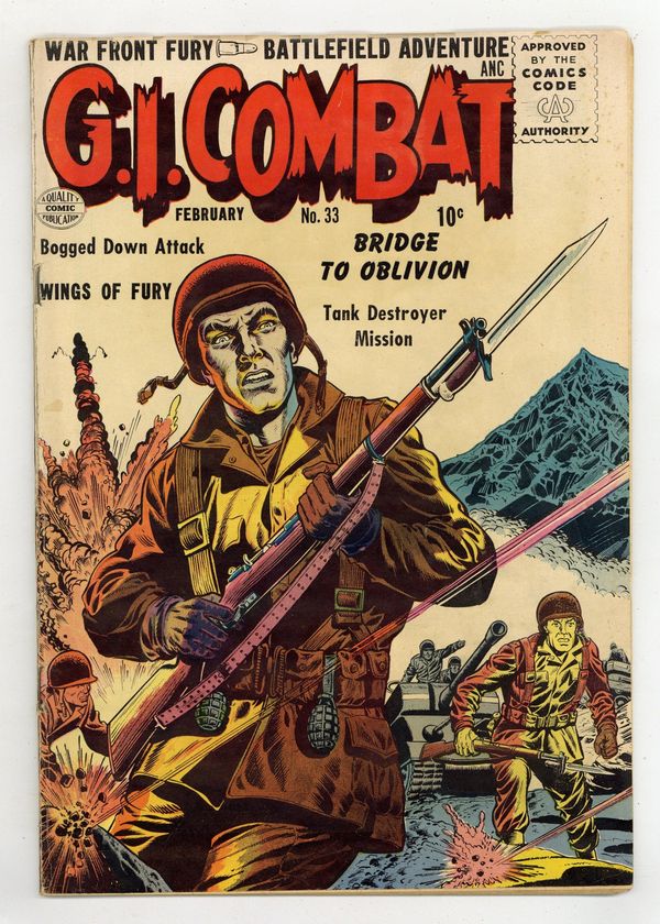 Cover pencils by Dick Dillin. Written by Joe Millard and unknown. Art by Dick Dillin and unknown. War front fury! Battlefield adventure! In this issue: "Bridge to Oblivion" by Joe Millard and Dick Dillin, reprinted from issue #4 (original title: "Bridge to Bloody Hell!"); "Bogged Down Attack," reprinted from issue #7; "Wings of Fury"; 1-page text story "Sam's Last Laugh"; and "Tank Destroyer Mission," reprinted from issue #7. 36 Pages, Full Color. Cover price $0.10.
