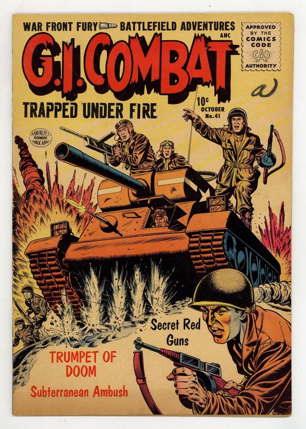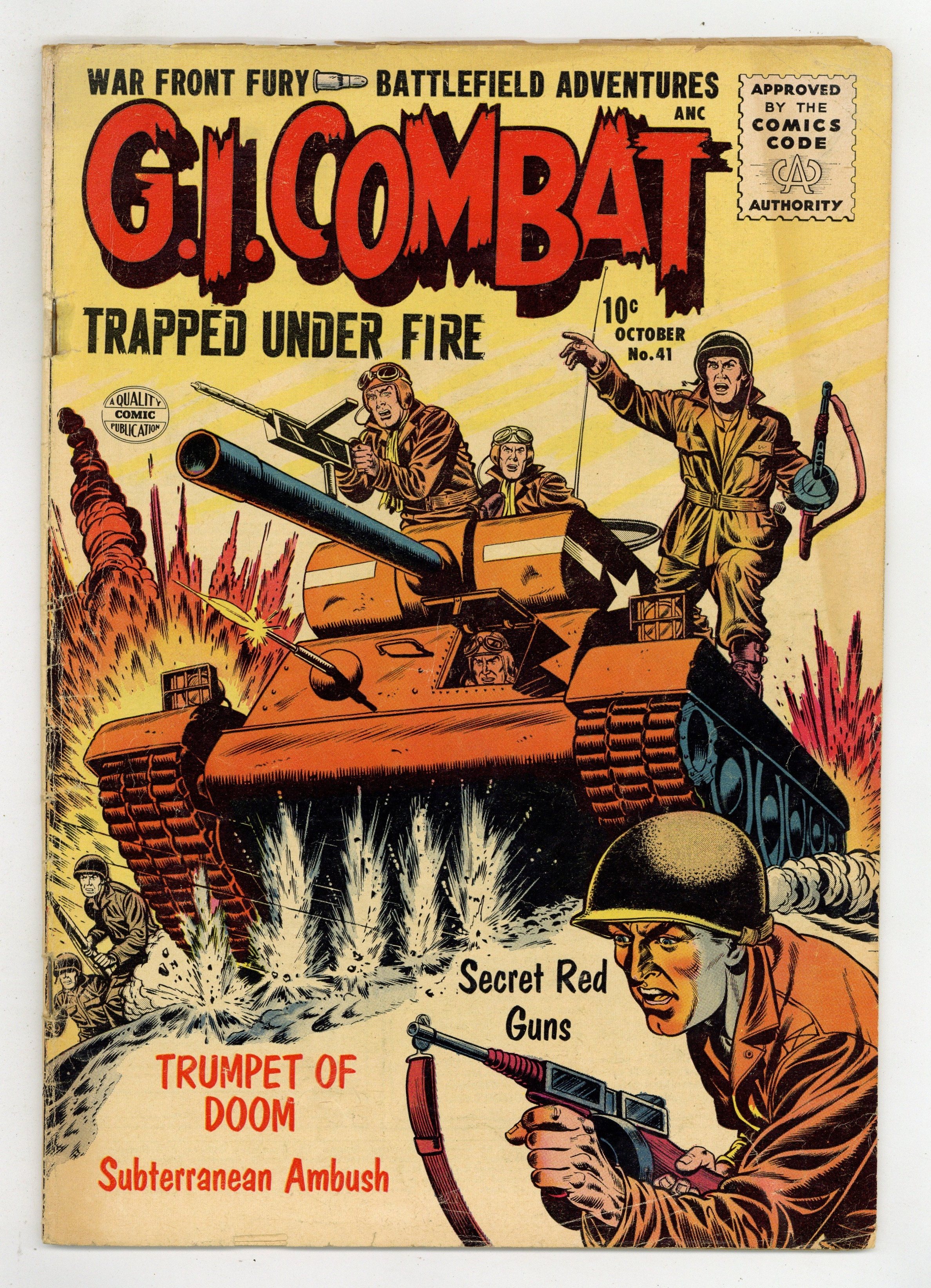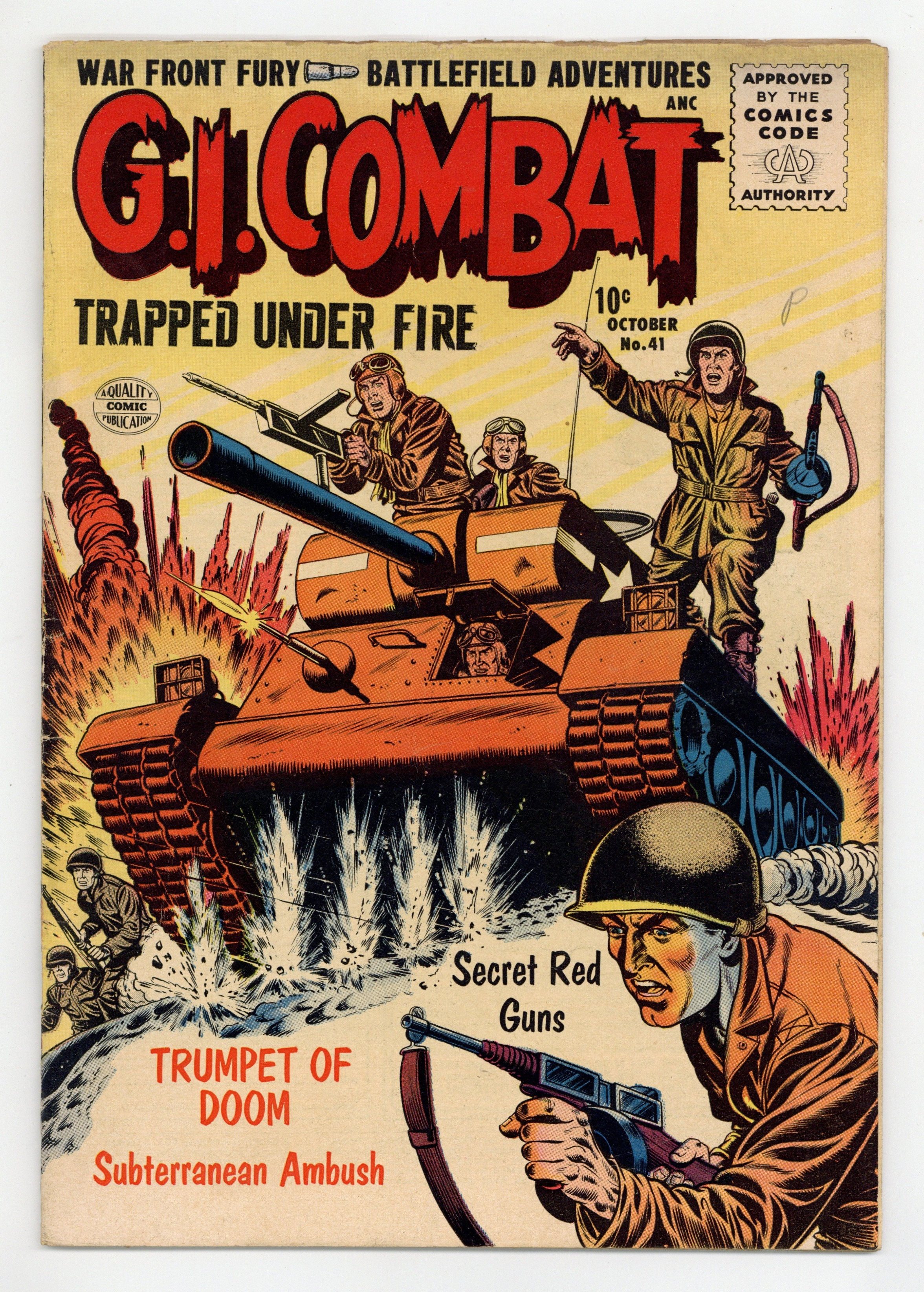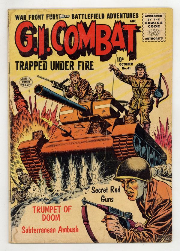 Cover by Dick Dillin and Chuck Cuidera. Written by unknown. Art by Charles Nicholas and unknown. War front fury! Battlefield adventures! In this issue: "Trapped Under Fire," with pencils by Charles Nicholas, reprinted from issue #16; "Subterranean Ambush"; "Trumpet of Doom," reprinted from issue #1 (original title: "Trumpet of Death"); 1-page text story "Wildfire"; and "The Secret Red Guns"! 36 Pages, Full Color. Cover price $0.10.