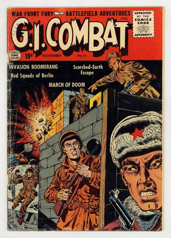 November 1956: Cover by Dick Dillin and Charles Cuidera; "The March of Doom," 9 pages; "Scorched-Earth Escape," 6 pages (reprinted from G.I. Combat #17); "Invasion Boomerang," 7 pages; "Treachery in Korea," 1 page text story; "The Red Squad of Berlin," 6 pages (reprinted from G.I. Combat #14, original title was "Red Goons of Berlin"). 36 Pages, Full Color. Cover price $0.10.