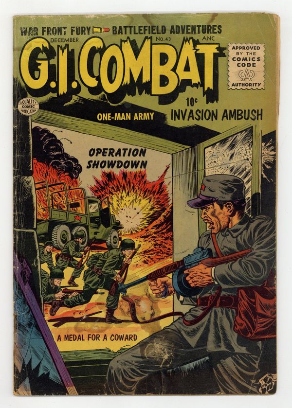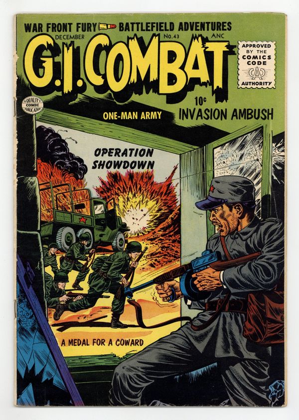 Cover by Dick Dillin? and Chuck Cuidera. Written by unknown. Art by Charles Nicholas, Dick Dillin? and unknown. War front fury! Battlefield adventures! In this issue: "One Man Army," with pencils by Charles Nicholas, reprinted from issue #13; "Invasion, Ambush," with pencils by Dick Dillin?; "A Medal for a Coward," reprinted from issue #13; 1-page text story "Trap for Trappers," reprinted from Blackhawk (1944 1st Series) #90; and "Operation Showdown"! 36 Pages, Full Color. Cover price $0.10.