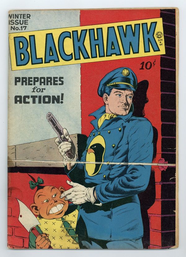 Cover by Al Bryant. Featuring: 12 page Blackhawk story "The Quest For Chuck's Father" drawn by Bill Ward; 11 page Blackhawk story "The Magic of the Shaman" drawn by Bill Ward; 8 page Chop Chop story "The Emperor's Jewels" drawn by Bill Ward; 2 page text story "Of Men and Murder"; 14 page Blackhawk story "King For a Day" starring Queen Mokina and Hakdar, drawn by Bill Ward. 52 Pages, Full Color. Cover price $0.10.