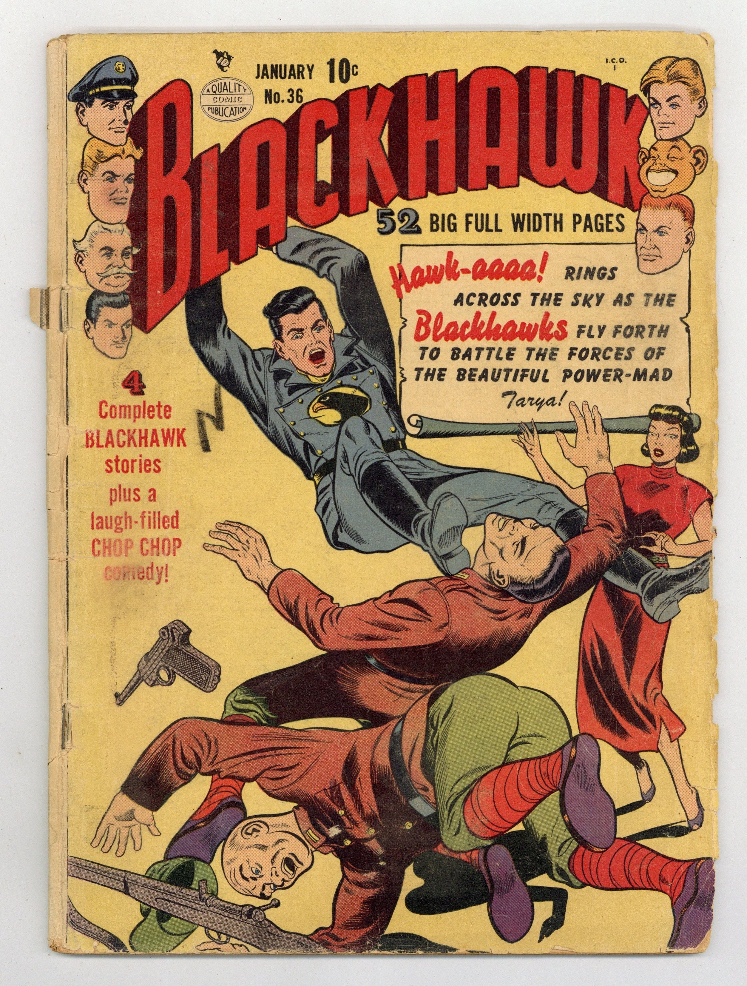 Cover art by Reed Crandall. The Prison of Despair, art by Jack Alderman; Blackhawk tries to protect Khartoor from invasion by Jinnestan, recently under control of the mysterious and beautiful Tarya. The Air Raiders; Blackhawk takes on a group of air pirates led by a beautiful and mysterious woman bandit. Untitled Blackhawk story, art by Bill Ward; In the mid European town of Novolta and old clock which hasn't stuck in centuries suddenly starts chiming and people start dying. The Veiled Princess starring Chop Chop, script and art by Paul Gustavson. The Legion of Corpses, art by Jack Alderman; Blackhawk helps defend a French fort against Bedouin attackers. 52 Pages, Full Color. Cover price $0.10.