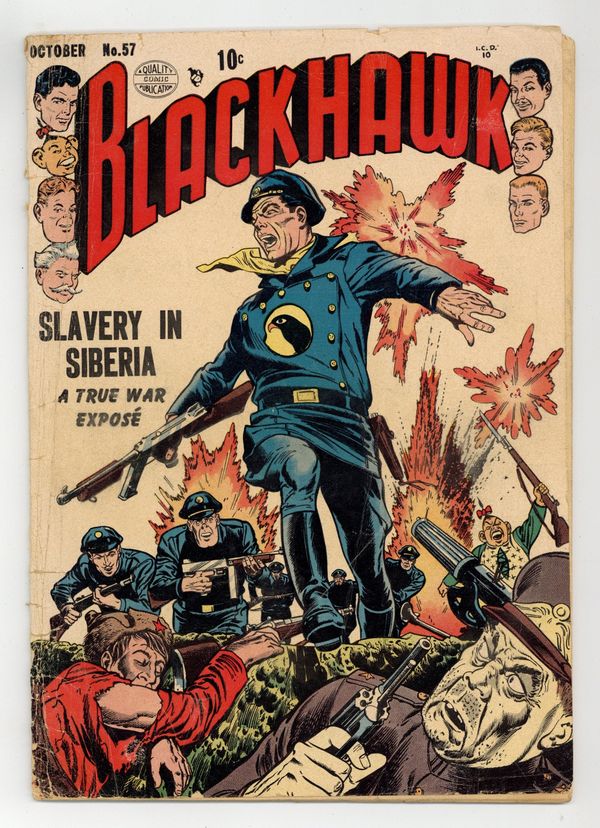 Cover by Reed Crandall. Featuring: 10 page Blackhawk story "Slavery In Siberia" (a true war exposé) drawn by Reed Crandall; 4 page Chop Chop story; 7 page Blackhawk story "The Terrible Termite Twins"; 7 page Blackhawk story "The Paralyzed City of Armored Men" starring Boris Galub and Nalita. 36 Pages, Full Color. Cover price $0.10.