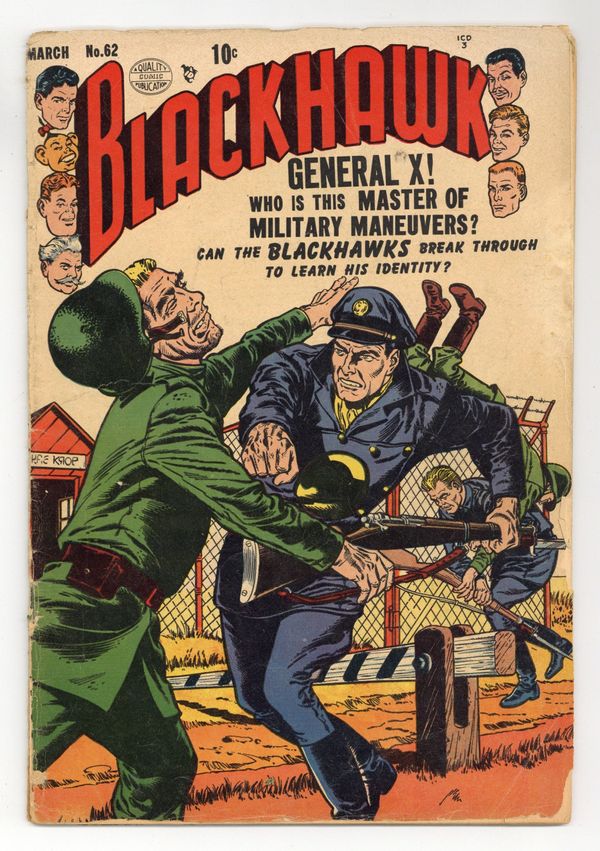 Cover by Reed Crandall. Stories by Paul Gustavson and unknown. Art by Paul Gustavson, Reed Crandall, Bill Ward and unknown. "General X!" Who is the master of military maneuvers? Can the Blackhawks break through to learn his identity? Blackhawk is also featured in: "The Return of Genghis Khan" with art by Bill Ward; "The Isle of the Damned" with art by Reed Crandall; and 1-page text story "Blackhawk's Luck," reprinted from Modern Comics (1945) #98. Plus: Chop Chop in an untitled back-up story by Paul Gustavson. 36 Pages, Full Color. Cover price $0.10.