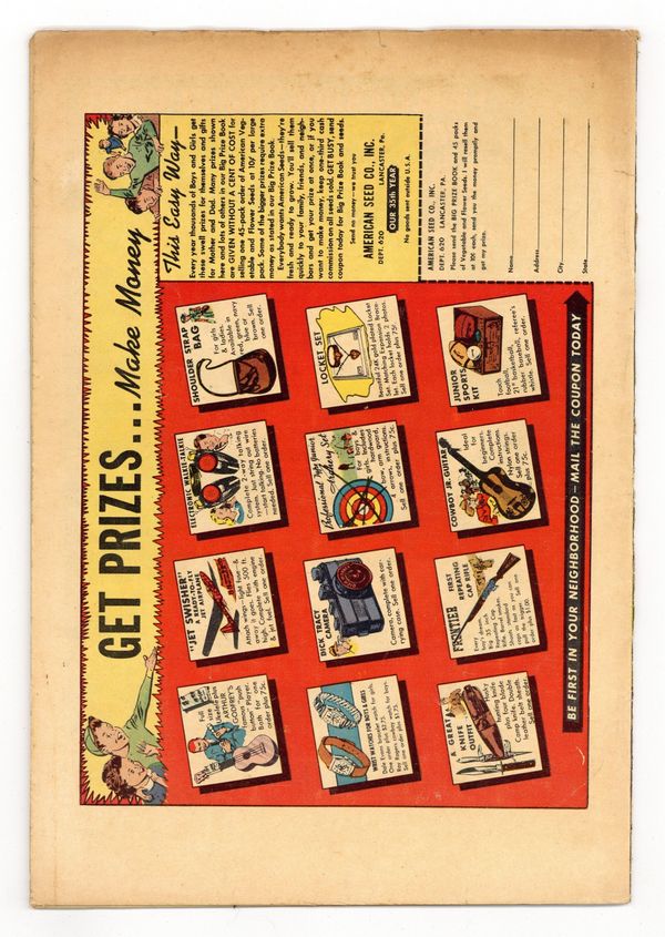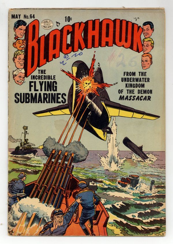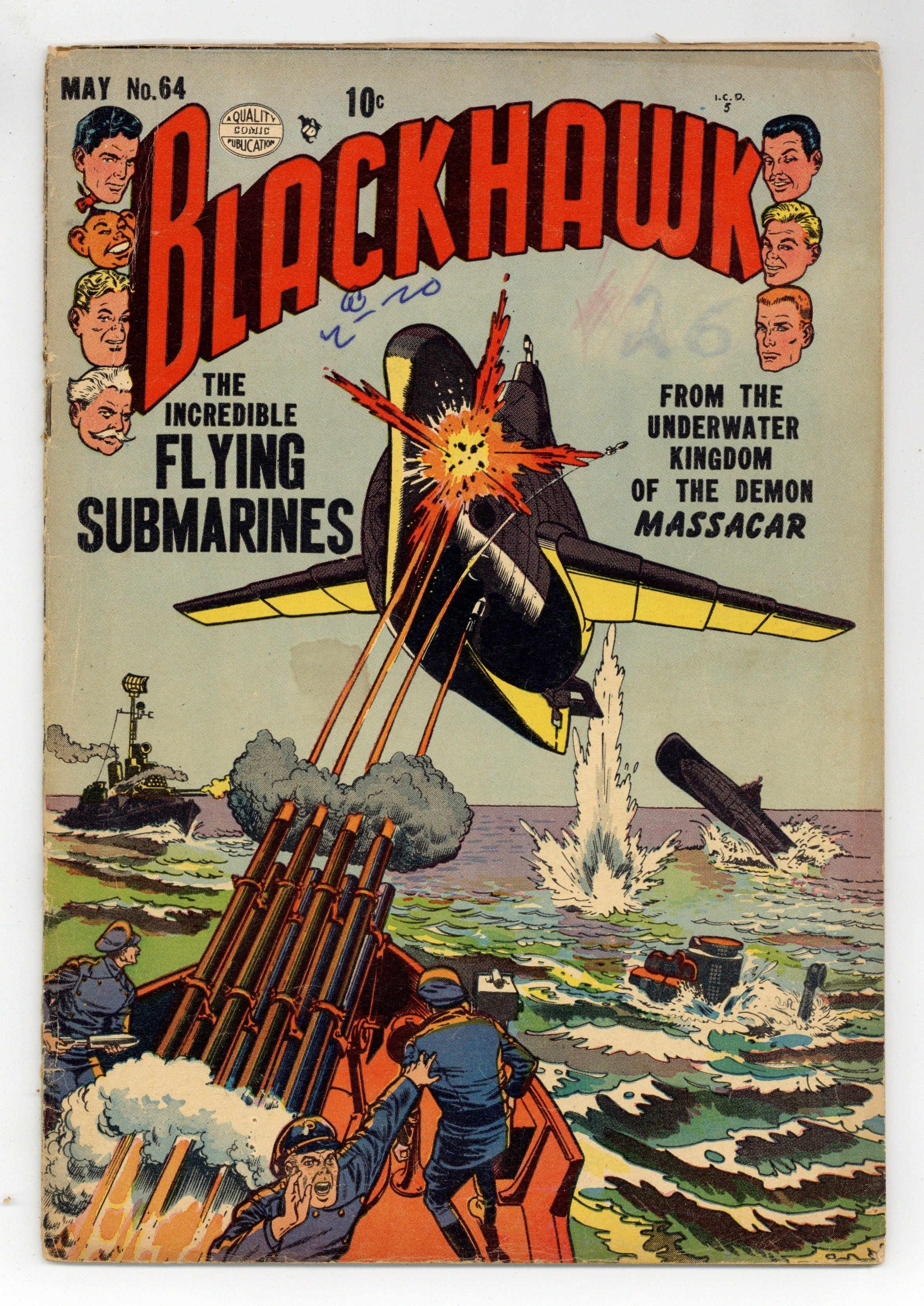 Cover by Reed Crandall. Stories by Paul Gustavson and unknown. Art by Paul Gustavson, Reed Crandall and unknown. From the underwater kingdom of the demon Massacar, here come..."The Flying Submarines!" with art by Reed Crandall. Blackhawk is also featured in "The Legion of the Doomed!" and "The Ghost of Blackhawk Island!" Plus: Chop Chop in an untitled back-up story by Paul Gustavson. And: 1-page text story "Top Secret"! 36 Pages, Full Color. Cover price $0.10.