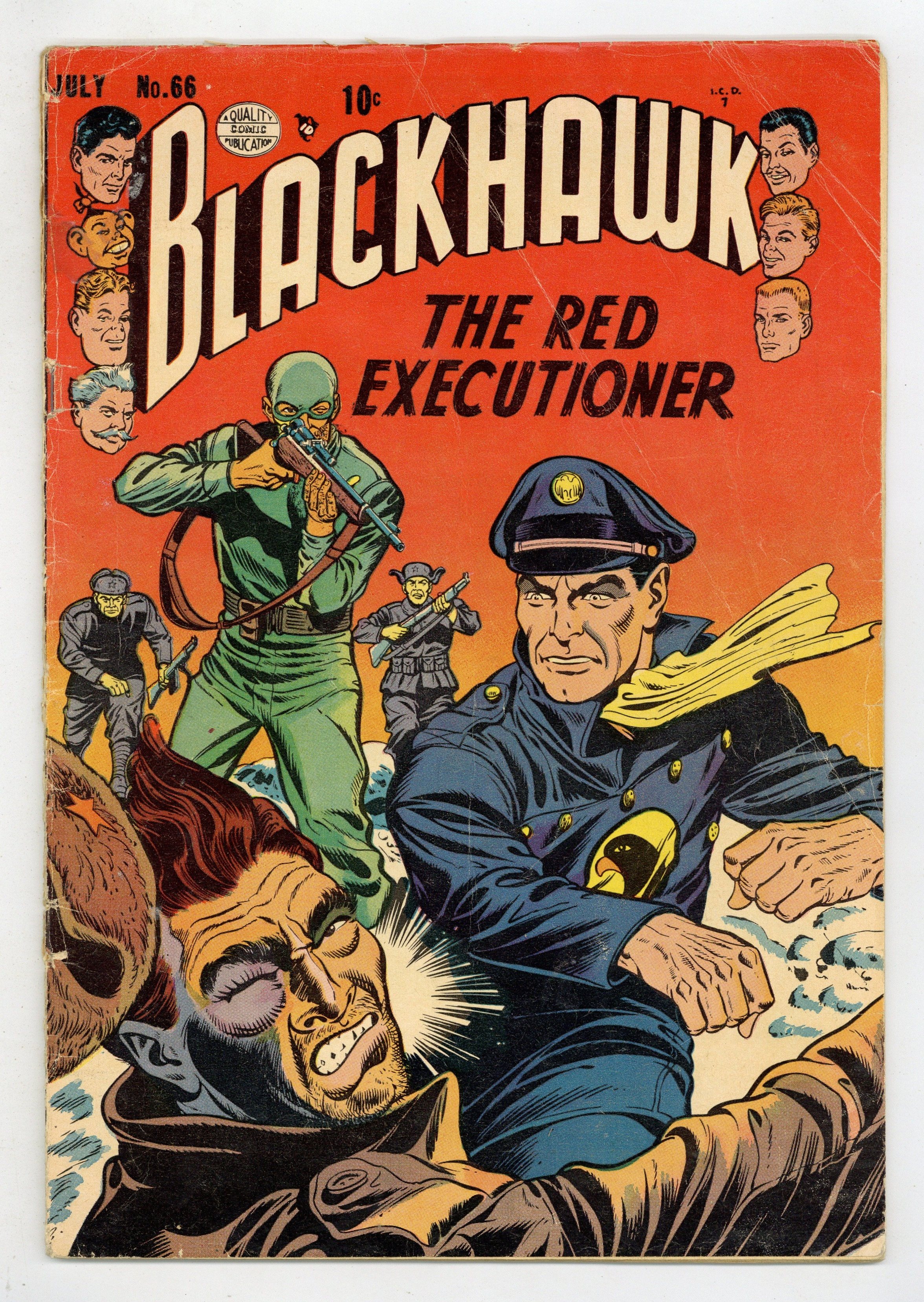 Cover by Dick Dillin and Chuck Cuidera. Stories by Paul Gustavson and unknown. Art by Paul Gustavson, Reed Crandall, Chuck Cuidera and unknown. Featuring Blackhawk in: "The Red Executioner" with pencils by Reed Crandall; "The Crawler" with inks by Chuck Cuidera; and "Prisoners of Space" with inks by Cuidera. Plus: Chop Chop in an untitled back-up story by Paul Gustavson. And: 1-page text story "What Is Proof"! 36 Pages, Full Color. Cover price $0.10.