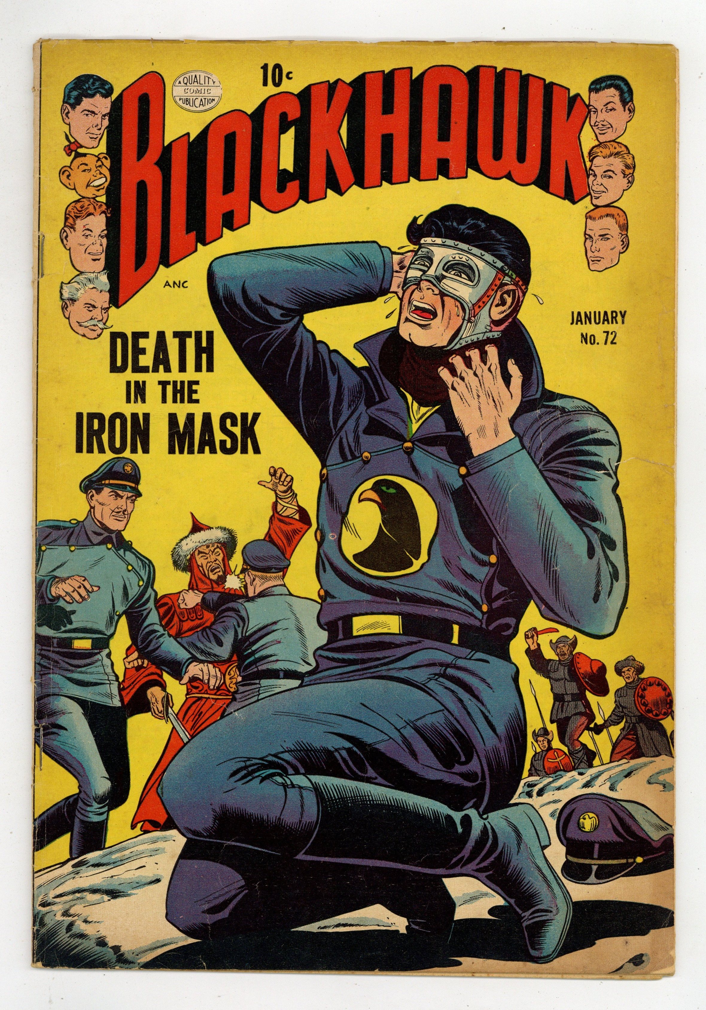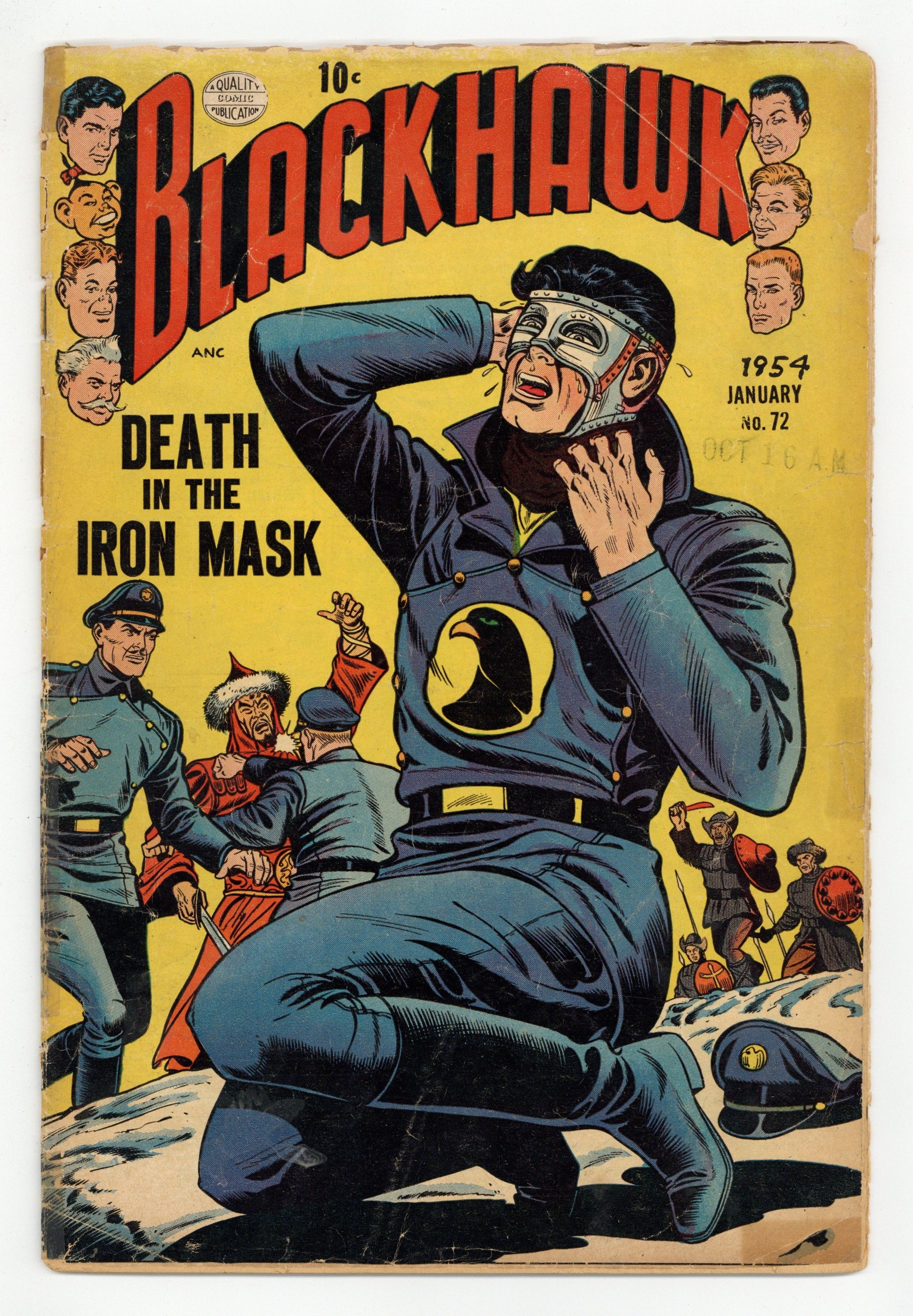 Cover by Dick Dillin and Chuck Cuidera. Stories by Dick Wood, Paul Gustavson and unknown. Art by Dick Dillin, Paul Gustavson and Chuck Cuidera. Featuring Blackhawk in: "Death In the Iron Mask" by Dick Wood, Dick Dillin and Chuck Cuidera; "The Death Legion" by Wood, Dillin and Cuidera; "The Invasion From Within" by Wood, Dillin and Cuidera; and 1-page text story "Dinner for Blackhawk," reprinted from Modern Comics (1945) #96. Plus: Chop Chop in an untitled back-up story by Paul Gustavson, reprinted from issue #38 (with a page cut and a panel re-lettered). 36 Pages, Full Color. Cover price $0.10.