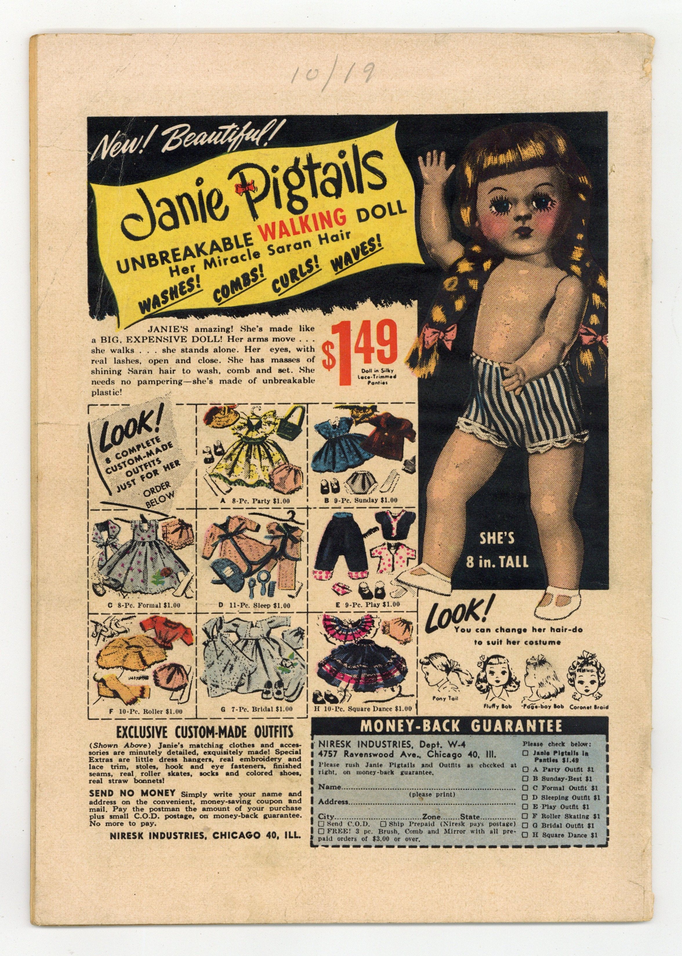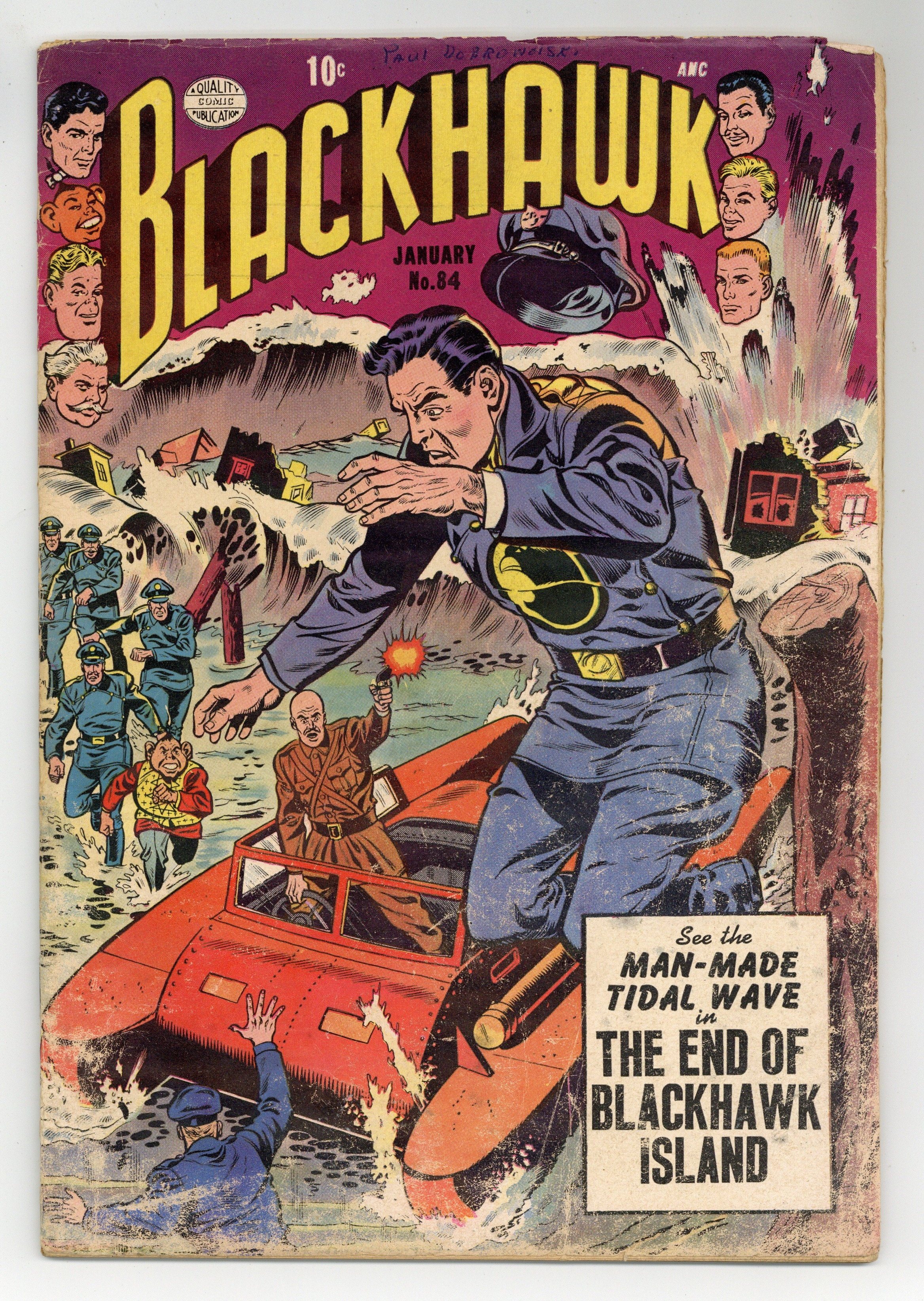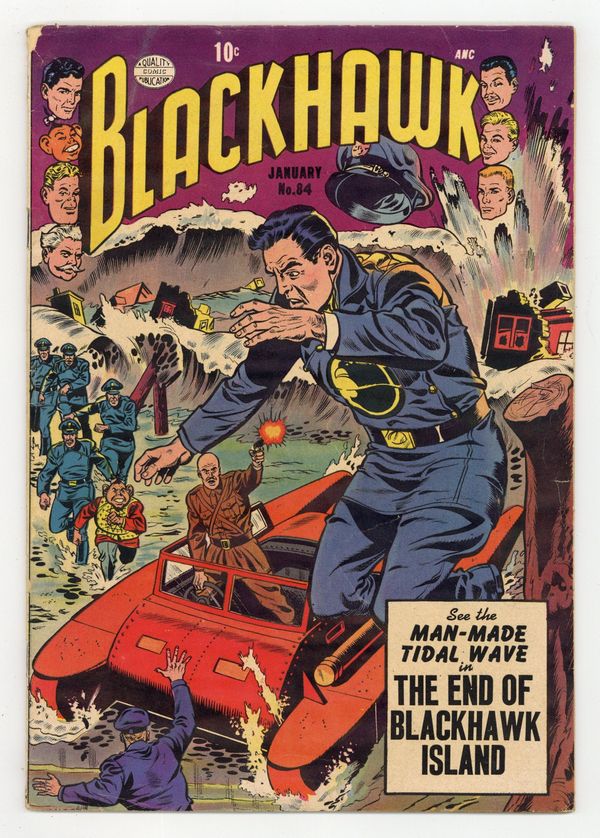 Cover by Dick Dillin and Chuck Cuidera. Stories by Dick Wood, Bill Finger, Paul Gustavson and unknown. Art by Dick Dillin, Paul Gustavson and Chuck Cuidera. See the man-made tidal wave in "The End of Blackhawk Island" by Dick Wood, Dick Dillin and Chuck Cuidera. Blackhawk is also featured in "The Race of Doom" by Bill Finger, Dillin and Cuidera, and "The Dreaded Brain Beam" by Wood, Dillin and Cuidera. Plus: Chop Chop in an untitled back-up story by Paul Gustavson, reprinted from issue #40. And: 1-page text story "Operation Baby"! 36 Pages, Full Color. Cover price $0.10.