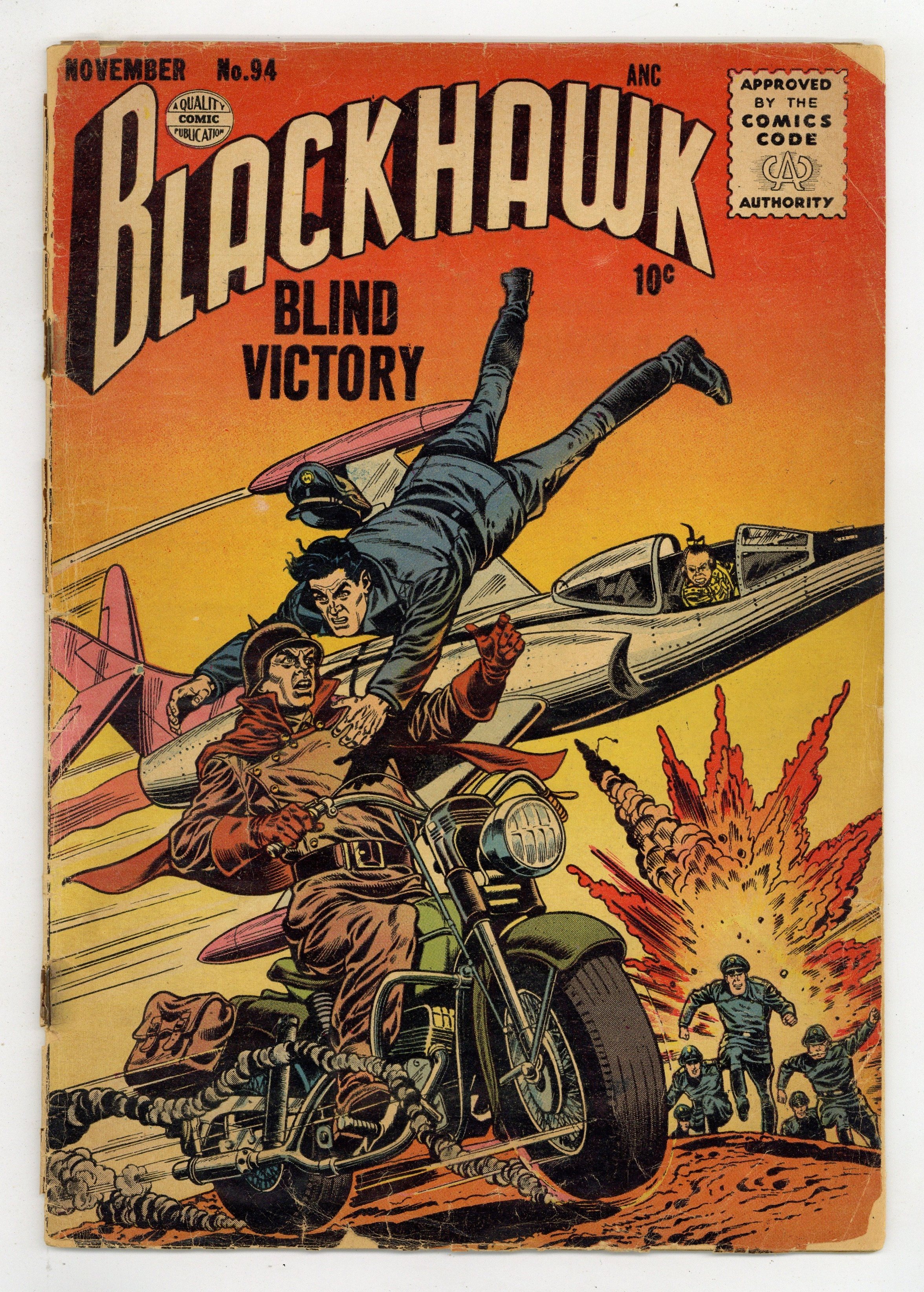 Cover by Dick Dillin and Chuck Cuidera. Stories by Joe Millard, Paul Gustavson and unknown. Art by Dick Dillin, Paul Gustavson and Chuck Cuidera. Featuring Blackhawk in: "The Web of the Black Widow!" by Joe Millard, Dick Dillin and Chuck Cuidera; "Blind Victory" by Millard, Dillin and Cuidera; and "The Prophet of Doom!" by Millard, Dillin and Cuidera. Plus: Chop Chop in an untitled back-up story by Paul Gustavson, reprinted from issue #42. And: 1-page text story "Incident In a Storm," reprinted from Plastic Man (1943 Vital/Quality) #42. 36 Pages, Full Color. Cover price $0.10.