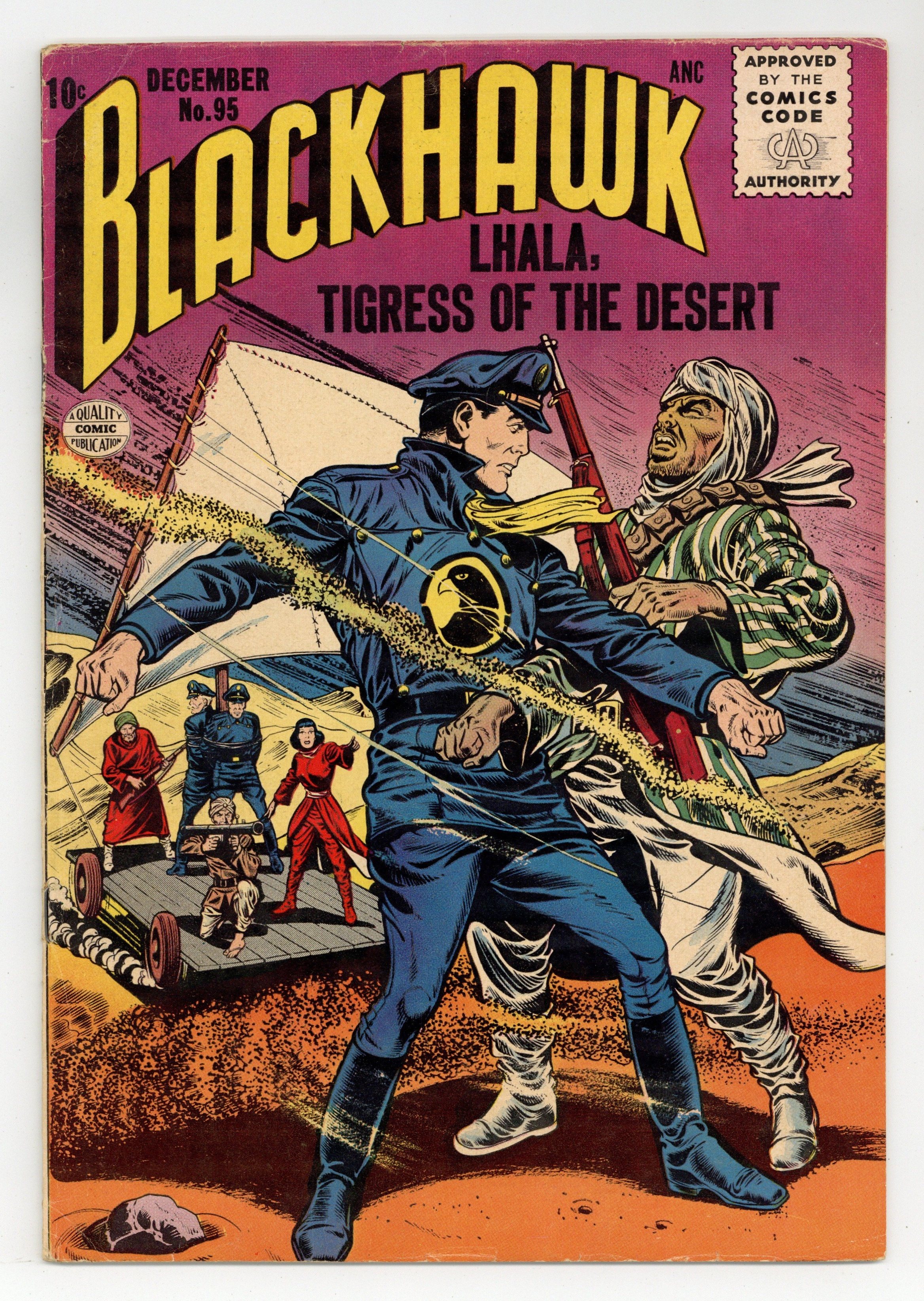 Cover by Dick Dillin and Chuck Cuidera. Stories by Joe Millard, Paul Gustavson and unknown. Art by Dick Dillin, Paul Gustavson and Chuck Cuidera. Featuring Blackhawk in: "Madam Fury, Queen of Pirates" by Joe Millard, Dick Dillin and Chuck Cuidera; "Terra the Trapper" by Millard, Dillin and Cuidera; and "Lhala, Tigress of the Desert" by Millard, Dillin and Cuidera. Plus: Chop Chop in the back-up story "The Great Palaver" by Paul Gustavson, reprinted from issue #48 (with a page cut, plus art changes). And: 1-page text story "A Lesson Well Learned," reprinted from Plastic Man (1943 Vital/Quality) #25. 36 Pages, Full Color. Cover price $0.10.