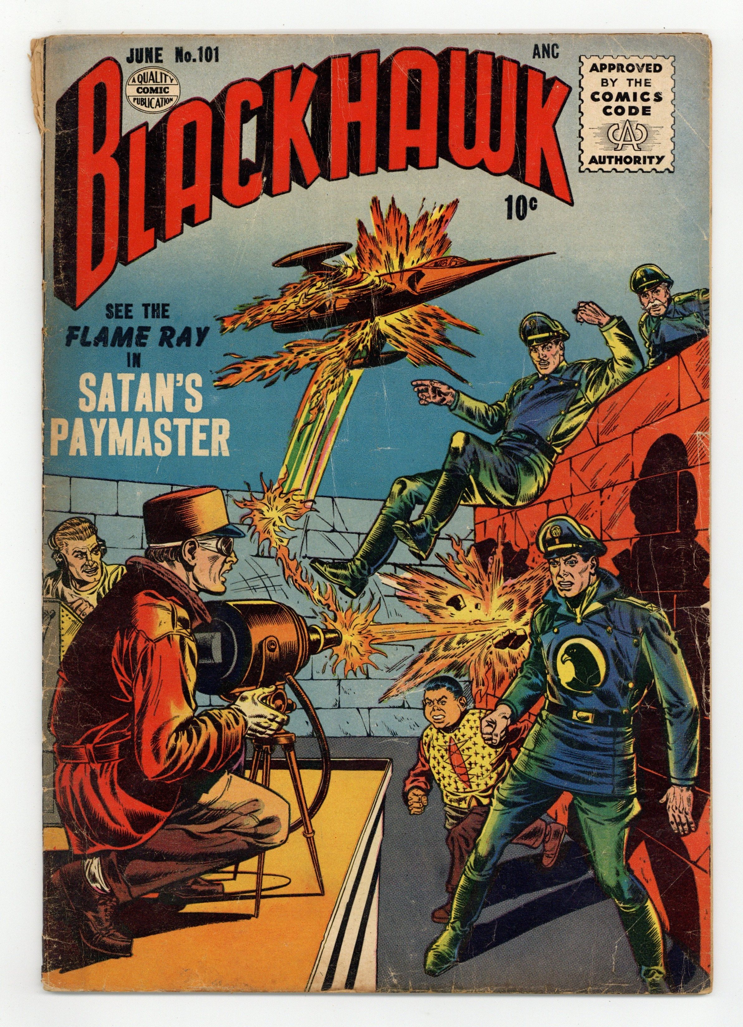 Cover by Dick Dillin and Chuck Cuidera. Stories by Joe Millard, Robert Bernstein and unknown. Art by Dick Dillin, Sam Citron and unknown. Featuring Blackhawk in: "General Steel" with story by Joe Millard; "Satan's Paymaster" with story by Millard; and "The Lost Island" with story by Robert Bernstein and pencils by Dick Dillin. Plus: Back-up story "The Incredible Exploits of Baron Von Richtofen" with art by Sam Citron. And: 1-page text story "Escape At Dawn," reprinted from GI Combat (1952) #13. 36 Pages, Full Color. Cover price $0.10.