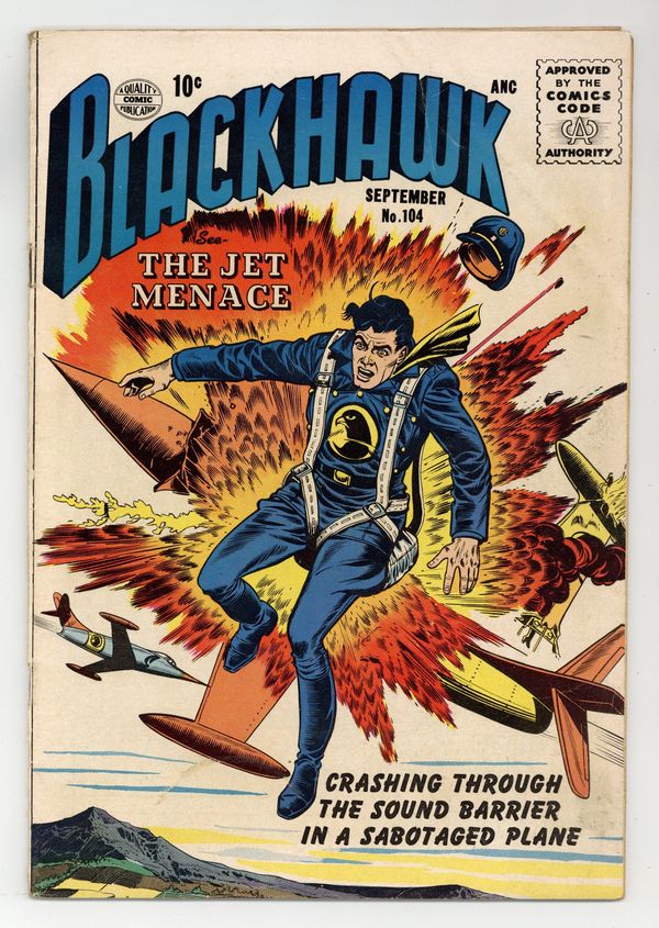 Cover by Dick Dillin and Chuck Cuidera. Stories by Robert Bernstein and unknown. Art by Dick Dillin, Chuck Cuidera and Sam Citron. Featuring Blackhawk in: "Rescue Under Fire" by Robert Bernstein, Dick Dillin and Chuck Cuidera; "Treachery In the Antarctic" by Bernstein, Dillin and Cuidera; and "The Jet Menace" by Bernstein, Dillin and Cuidera. Plus: Back-up story "Caged" by Bernstein and Sam Citron. And: 1-page text story "Hypno the Great," reprinted from Doll Man Quarterly (1941 Quality) #30. 36 Pages, Full Color. Cover price $0.10.