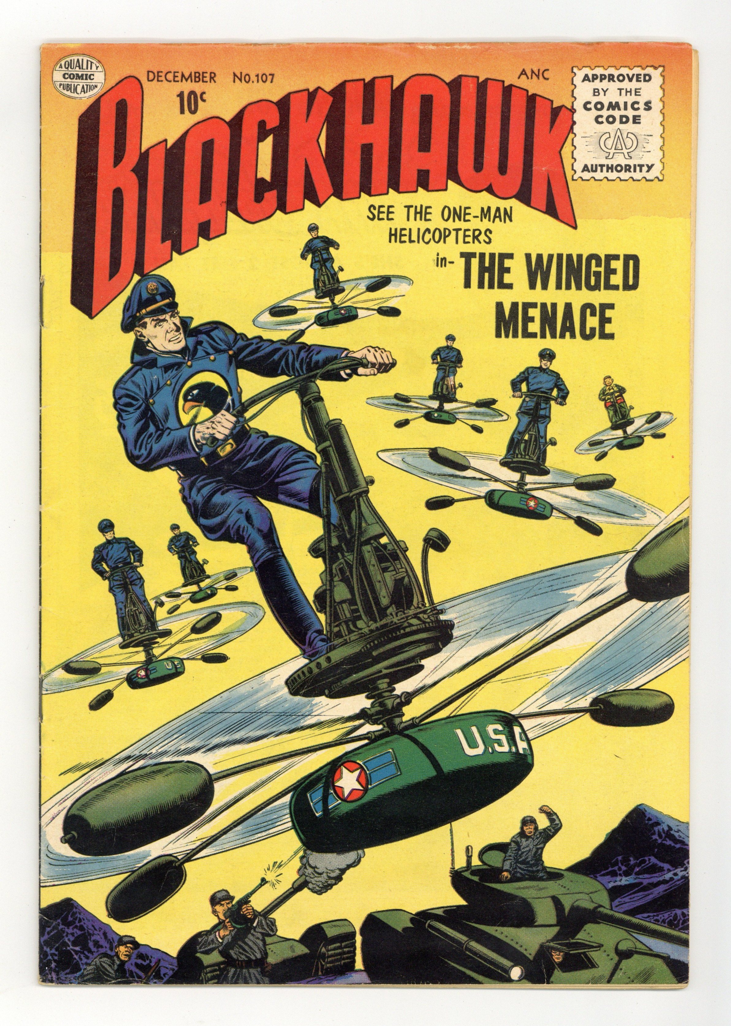 Last issue published by Quality. Cover by Dick Dillin and Chuck Cuidera. Stories by Robert Bernstein and unknown. Art by Dick Dillin, Chuck Cuidera and Sam Citron. Featuring Blackhawk in: "The Winged Menace" by Robert Bernstein, Dick Dillin and Chuck Cuidera; "Red Timetable of Treachery" by Bernstein, Dillin and Cuidera; "One Minute Till Doom" by Bernstein, Dillin and Cuidera; and 1-page text story "Origin of the Blackhawks," reprinted from issue #50. Plus: Back-up story "Red Helicopter Ambush" by Bernstein and Sam Citron. 36 Pages, Full Color. Cover price $0.10.