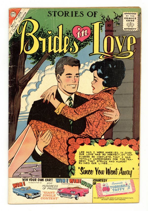 Published Nov 1960 by Charlton Comics Group.$55.00Cover by Vince Colletta. Stories and art by Vince Colletta, Charles Nicholas, and Sal Trapani. Newly married romance, and all the complications that go with it. Mary helps pianist Bob get his life back on track after his hands are damaged in a fire. Tess is alarmed by the control that her new husband's stepsister still has on his life. Nan's husband Lee mysteriously disappears, then abruptly returns months later. Goodbye To Love; Too Late For Tears; A Love To Share; Love Lasts; Since You Went Away. 32 pages, Full Color. Cover price $0.10.