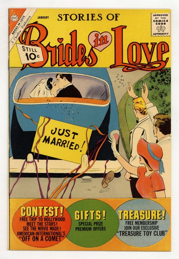 Published Jan 1962 by Charlton Comics Group.$45.00Cover by Vince Colletta. Stories and art by Joe Sinnott, Vince Colletta, Charles Nicholas, and Sal Trapani. Newly married romance, and all the complications that go with it. Dancer Suzanne tries to find success on stage, but nothing works until she meets Bill, in a story with art by future Fantastic Four legend Joe Sinnott. Tom is angered by the way his pregnant wife, Jan, depends more on her father than she does on Tom. After dating no one but Don, Jean decides she wants to play the field before they settle down. Plus advice on talking to boys, and a look at love traditions around the world. Beyond My Love; Conversationally Speaking; Love, Love Makes The World Go 'Round; Marriage on the Campus; First Man; Ask Me Twice. 32 pages, Full Color. Cover price $0.10.