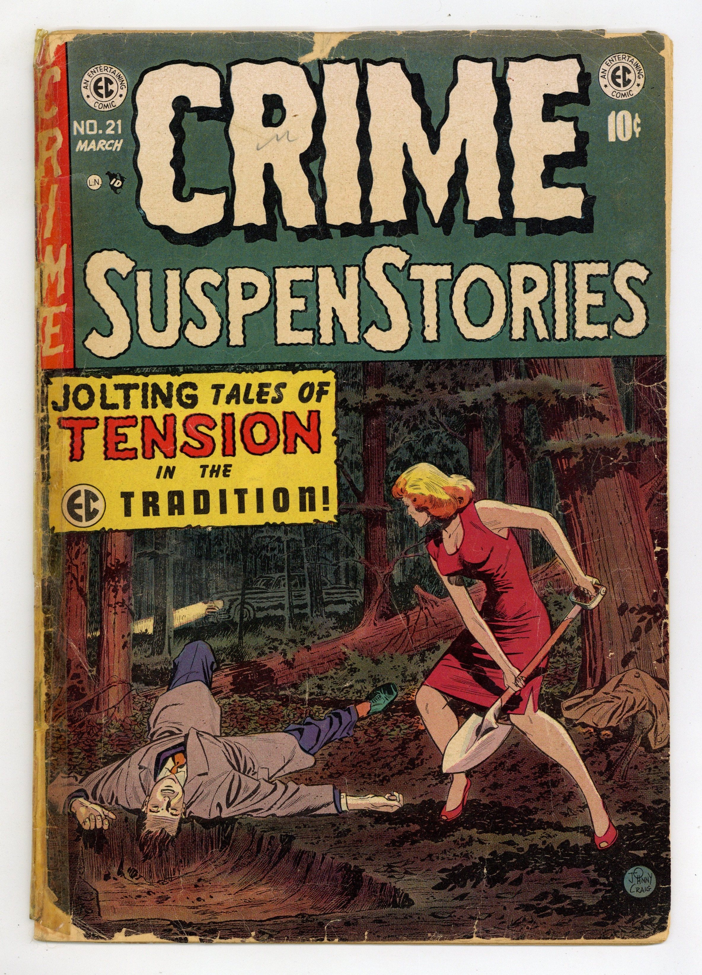 Cover art by Johnny Craig. "Mother's Day," script by Bill Gaines (co-plot) and Al Feldstein (co-plot, script), art by Reed Crandall; Brothers Fred and Harold grew up with Harold given the best of everything, and Fred began to hate his brother; One day, Fred discovered that Harold had committed a theft and decided to take the rap for his brother and went to jail. "In the Groove," script by Albert B. Feldstein, art by Jack Kamen; A small-time radio announcer devises a plot to kill his wife, while he was broadcasting at the radio station; But he does not foresee a snag in those plans with the pre-recorded record he made and was playing over the airwaves. "On Schedule!" text story by Albert B. Feldstein. "Understudies!", script and art by Johnny Craig; Gail and Jim are unhappily married to their respective spouses, but, in fact, love one another; They decide on a daring plan to kill their mates and dissolve their bodies in quicklime to leave no trace. "Blood Brothers," script b Bill Gaines (plot) and Albert B. Feldstein (plot, script), art by George Evans; Alex arrives unannounced at the beach house of his brother who invites him to stick around and stay with him; Alex's intent is to kill his brother after putting into place a whole series of alibis. 36 pgs., full color. Cover price $0.10.
