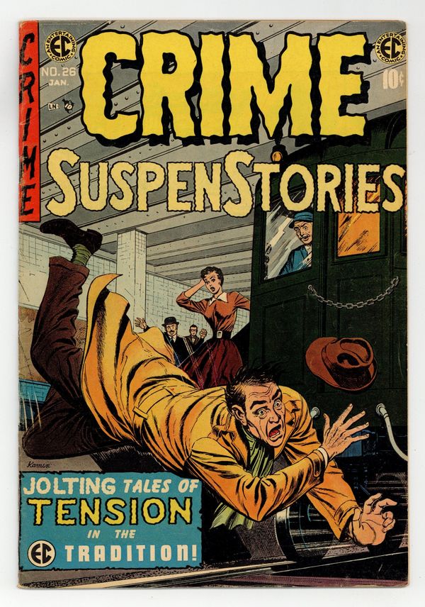Cover by Jack Kamen. Stories by Carl Wessler and Al Feldstein. Art by Jack Kamen, Marie Severin, Joe Orlando, and Reed Crandall. EC's New Trend crime title featured top-notch art and writing, barrier-pushing graphics and pre-Code violence. A struggling family takes a turn for the worse when suspicions fall on them for serial killings, but no one suspects the identity of the true murderer. A jealous husband sees a TV wrestling match as proof of his suspicions, but forgets that not everything you see on wrestling shows is real. A firefighter is the last person anyone would suspect of arson. The cover by Jack Kamen directly references Bernie Krigstein's famous story "Master Race," originally scheduled for this issue, but postponed to Impact (1955 EC) #1 instead due to art delays. The Fixer; Dead Center; The Firebug; Comeback. 36 pages, Full Color. Cover price $0.10.