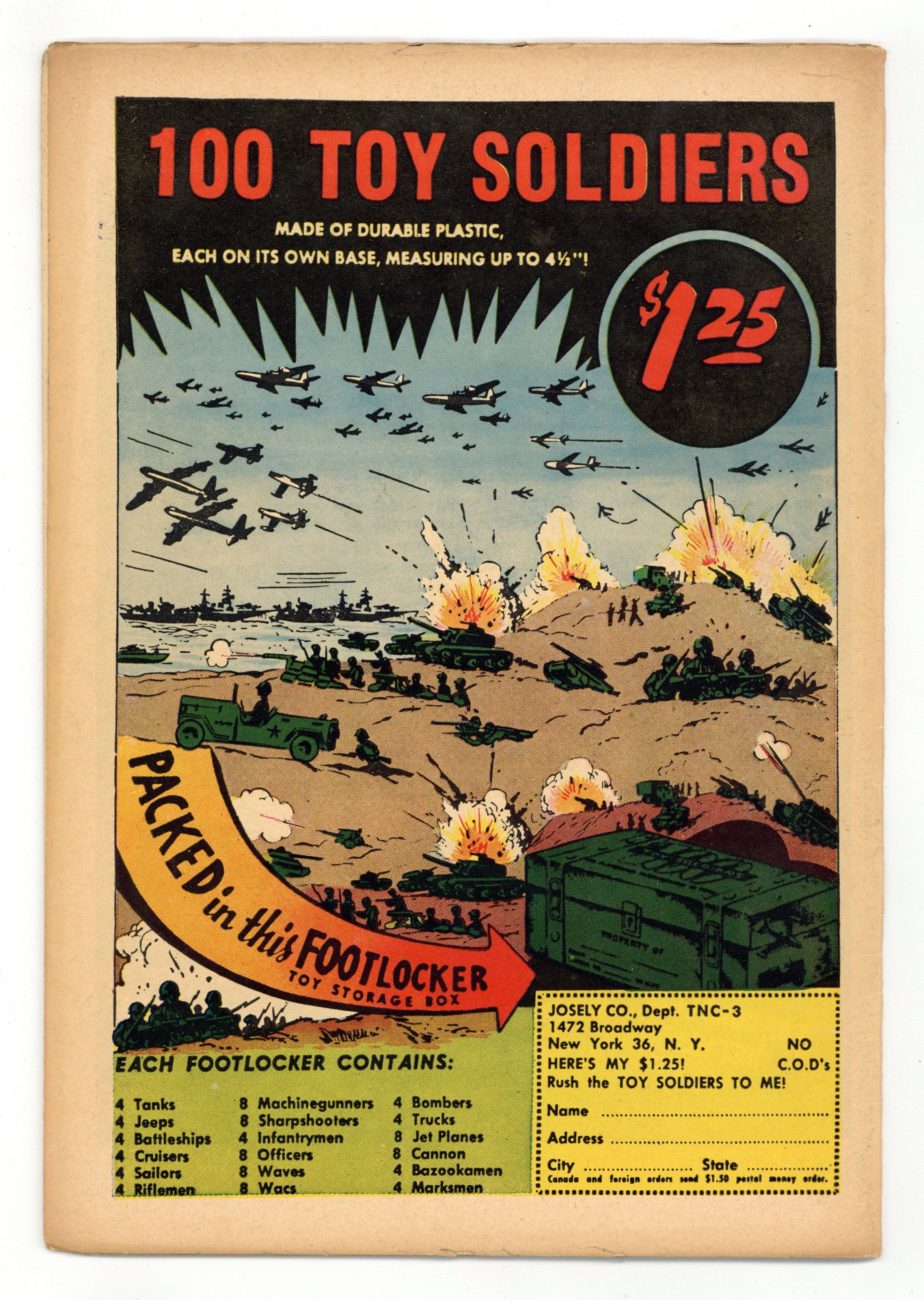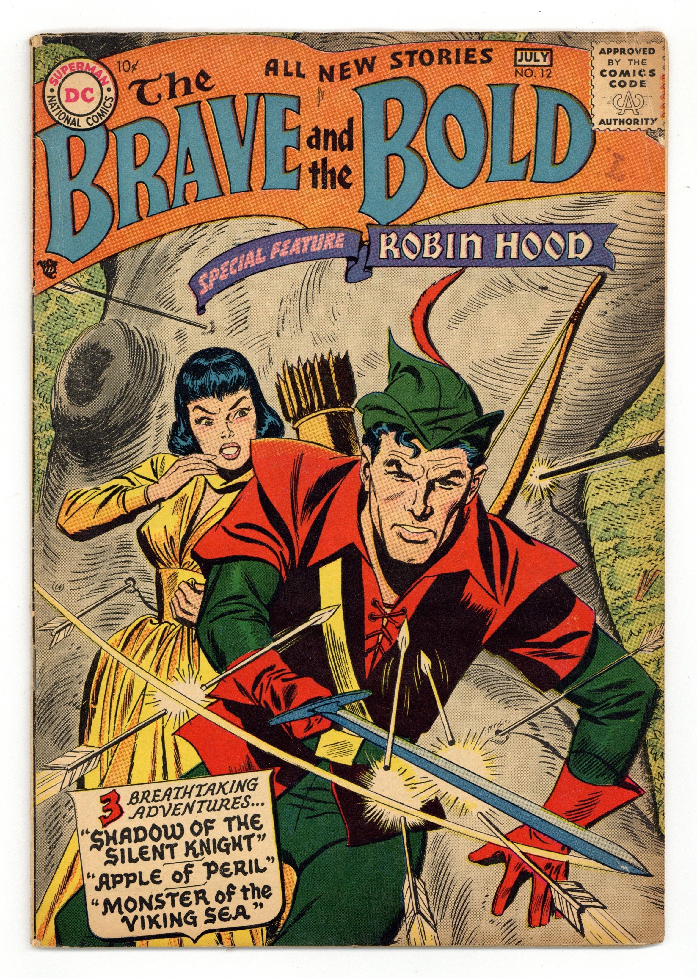 $130.00Cover by Irv Novick. "The Apple of Peril!", script by Bob Haney, art by Russ Heath; In a ruse to trap Robin Hood, Prince John offers a priceless golden apple to the person who can accomplish three feats, but Robin successfully completes the tasks and escapes the clutches of the prince. Short accounts of duels between Alexander Hamilton and Aaron Burr and others, art by Mort Drucker. "Monster of the Viking Sea!", script by Bob Haney, art by Joe Kubert; When Viking Prince finds a dinosaur, Ulric tries to use the beast to kill the prince. Sgt. Bilko ad. Knight-Time! article by Julius Schwartz, pencils by Morris Waldinger, inks by Tommy Nicolosi; facts about knights. Battle of the Giants article by Jack Miller, pencils by Morris Waldinger, inks by Tommy Nicolosi; An account of the battle between Pompey and Julius Caesar. "Shadow of the Silent Knight," script by Robert Kanigher, art by Irv Novick; Attempting to gain the Silent Knight's attention, Lancelot and Sir Galahad approach Lady Celia, each trying to outdo the other to win her favor. 36 Pages, Full Color. Cover price $0.10.