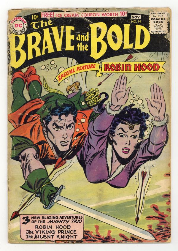Cover by Irv Novick. "The Armor of Doom!", script by Robert Kanigher, art by Irv Novick; Sir Edwin believes the Silent Knight is someone in castle Greystone, so he has his armorer craft armor that is identical to the Silent Knight's; Brian is in trouble when it turns out he's the only one for whom it fits. Strange Arrow Beliefs! article by Julius Schwartz, pencils by Morris Waldinger, inks by Tommy Nicolosi. "The Ghost Ship!", script by Bob Haney, art by Joe Kubert; A gang of pirates thought they saw the last of the Viking Prince when they watched him fall from a ledge; But Jon lived, and he uses their superstitious nature against them to drive them away. "The Secret of Sherwood Forest," script by Bill Finger, art by Russ Heath; Robin Hood rescues Little John from the dungeon during a masquerade party at Prince John's castle; However, fleeing is more difficult than before, as no matter how dense Sherwood Forest is, the Sheriff always seems to track their exact movements. 36 Pages, Full Color. Cover price $0.10.