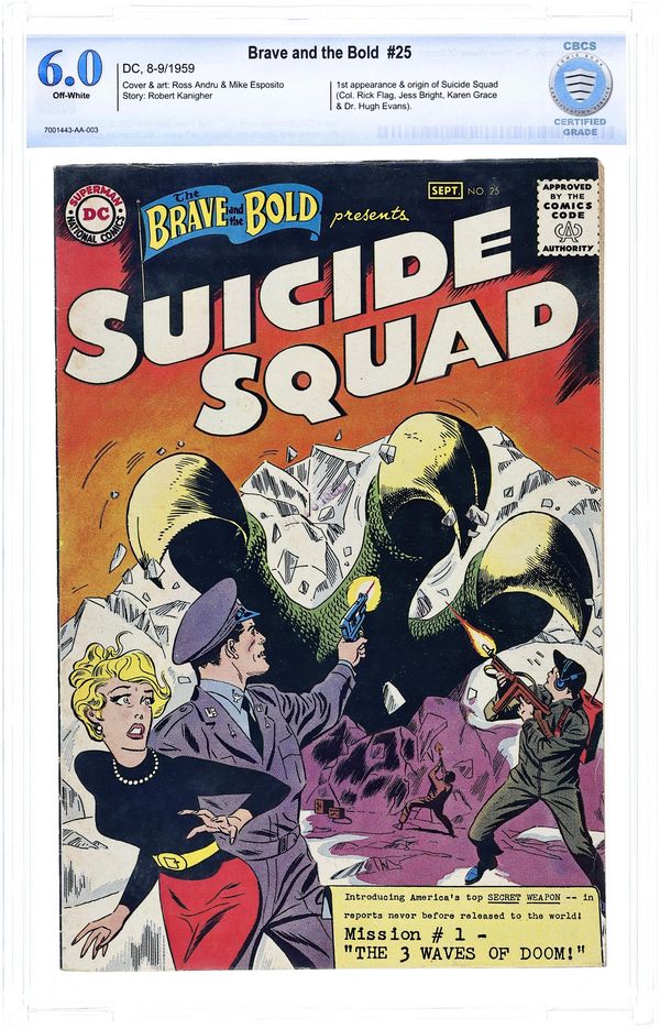 Cover pencils by Ross Andru, inks by Mike Esposito. Featuring the first appearance of the Suicide Squad! Introducing America's top secret weapon - in reports never before released to the world! Mission #1 - "The Three Waves of Doom!", script by Robert Kanigher, pencils by Ross Andru, inks by Mike Esposito; A large wave carrying a reddish hued object begins to ebb its way towards a seaside resort; As onlookers run, they feel a great heat coming from the wave, as it turns the sand into glass beneath it; Firefighters and bombers carrying foam bombs are unable to stop the heated object, and are forced to retreat as it causes their hoses and wings to melt!; When all other options are exhausted, the military commander puts in a call to the new team, the Suicide Squad!; Colonel Rick Flag is the Suicide Squad's team leader, and pilot of the "flying laboratory," a plane with special equipment on board for analyzing and testing; Beside him sits Karin Grace, flight medic for the team who is secretly attracted to Rick; The lab section of the plane holds the astronomer Dr. Evans and physicist Jess Bright; As the plane flies over the strange heated anomaly it is brought into an uncontrolled dive! 36 Pages, Full Color. Cover price $0.10.